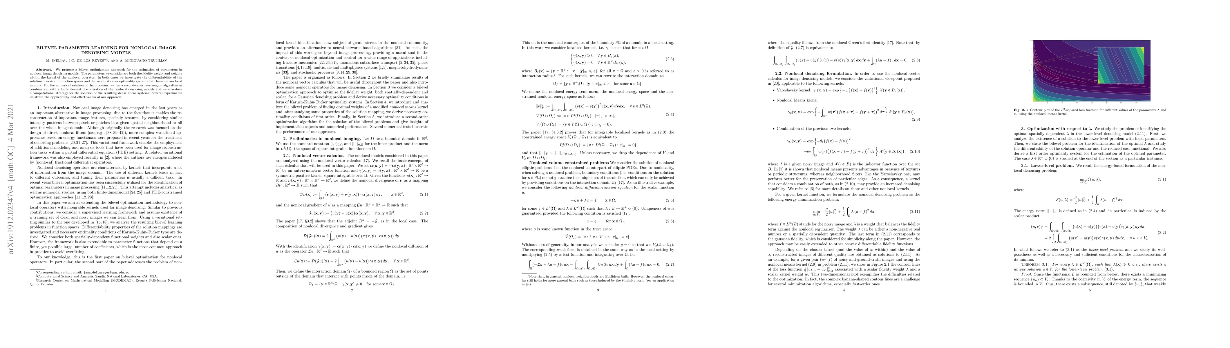 We propose a bilevel optimization approach for the estimation of parameters in nonlocal image denoising models. The parameters we consider are both the fidelity weight and weights within the kernel of the nonlocal operator. In both cases we investigate the differentiability of the solution operator in function spaces and derive a first order optimality system that characterizes local minima. For the numerical solution of the problems, we use a second-order trust-region algorithm in combination with a finite element discretization of the nonlocal denoising models and we introduce a computational strategy for the solution of the resulting dense linear systems. Several experiments illustrate the applicability and effectiveness of our approach.