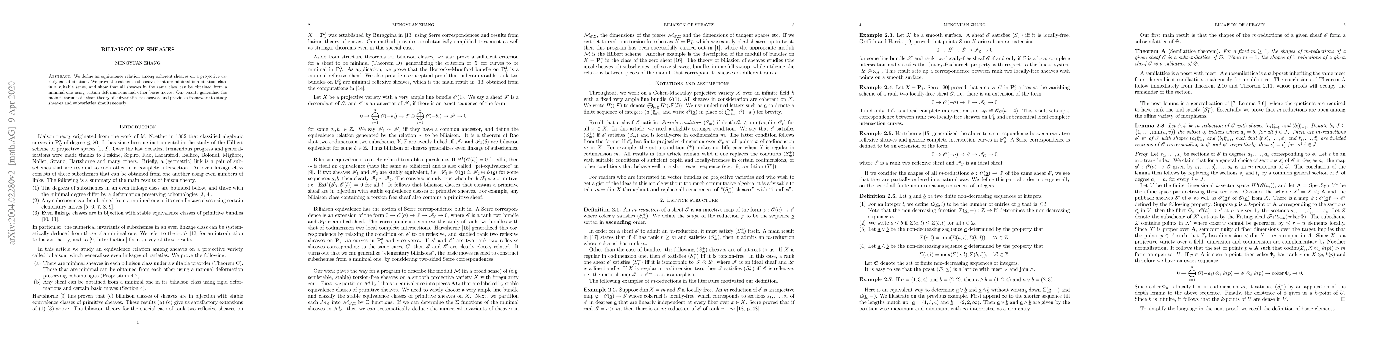 The paper introduces biliaison, an equivalence relation for coherent sheaves on projective varieties, proving the existence of minimal sheaves within each class and demonstrating that all sheaves in a class can be derived from a minimal one through deformations. It extends liaison theory to sheaves, offering a unified framework for studying sheaves and subvarieties.