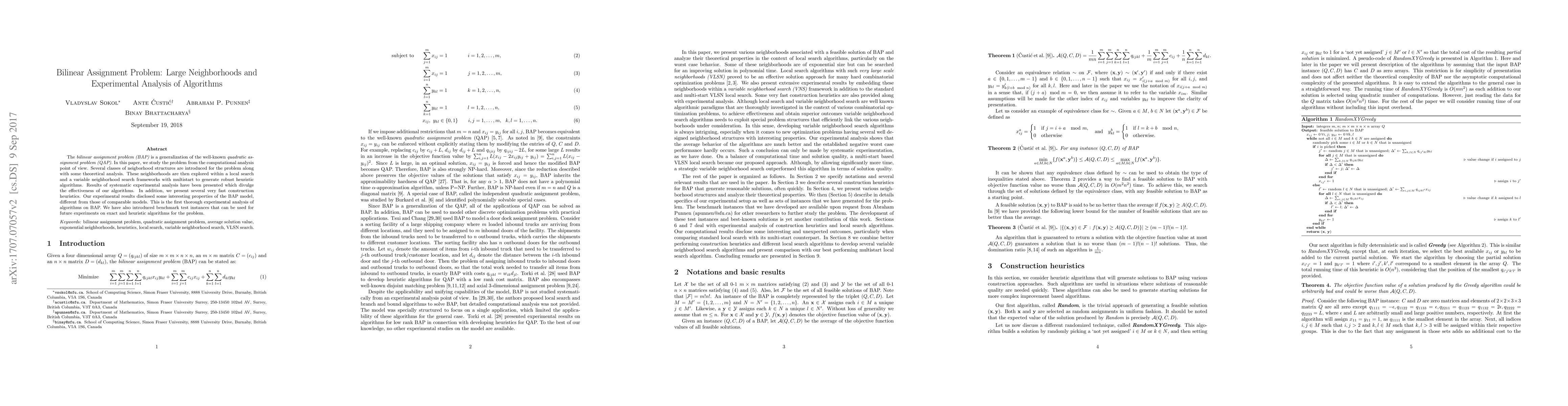 The bilinear assignment problem (BAP) is a generalization of the well-known quadratic assignment problem (QAP). In this paper, we study the problem from the computational analysis point of view. Several classes of neigborhood structures are introduced for the problem along with some theoretical analysis. These neighborhoods are then explored within a local search and a variable neighborhood search frameworks with multistart to generate robust heuristic algorithms. Results of systematic experimental analysis have been presented which divulge the effectiveness of our algorithms. In addition, we present several very fast construction heuristics. Our experimental results disclosed some interesting properties of the BAP model, different from those of comparable models. This is the first thorough experimental analysis of algorithms on BAP. We have also introduced benchmark test instances that can be used for future experiments on exact and heuristic algorithms for the problem.