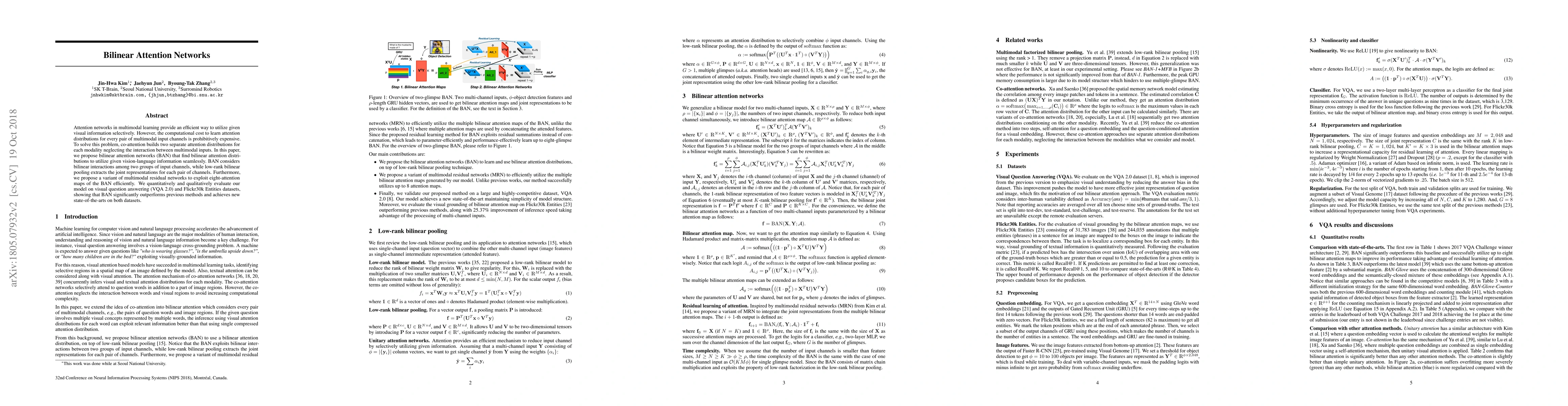 Bilinear Attention Networks (BAN) improve multimodal learning efficiency by using bilinear attention distributions to utilize vision-language information seamlessly. BAN outperforms previous methods on visual question answering and Flickr30k Entities datasets.