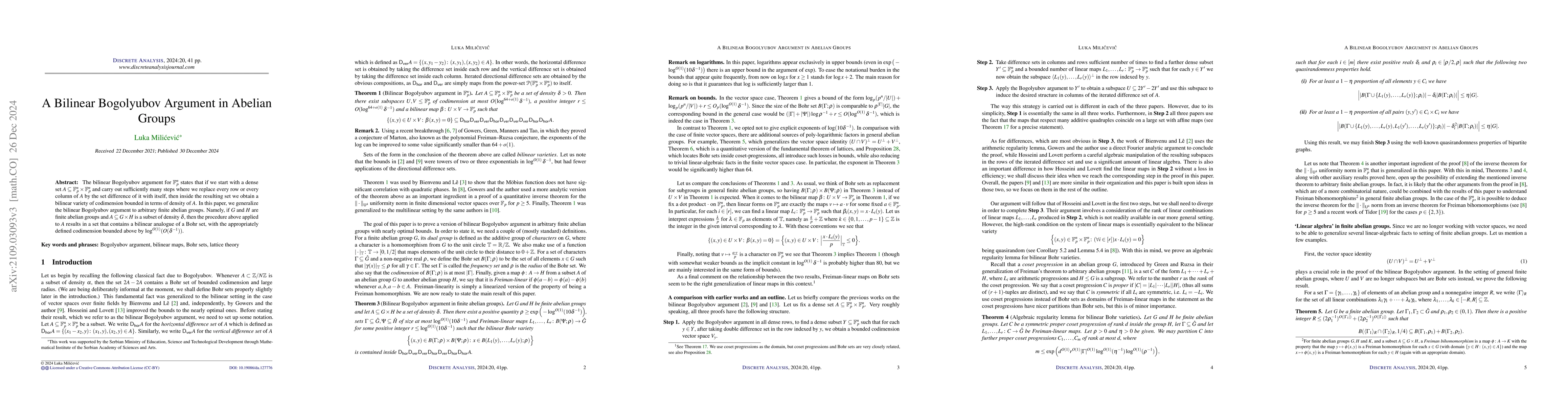 This paper generalizes the bilinear Bogolyubov argument to finite abelian groups, demonstrating that a dense subset $A$ of $G \times H$ transforms through a series of set differences into a set containing a bilinear analogue of a Bohr set, with codimension bounded by $\log^{O(1)} (O(\delta^{-1}))$ based on the initial density $\delta$.