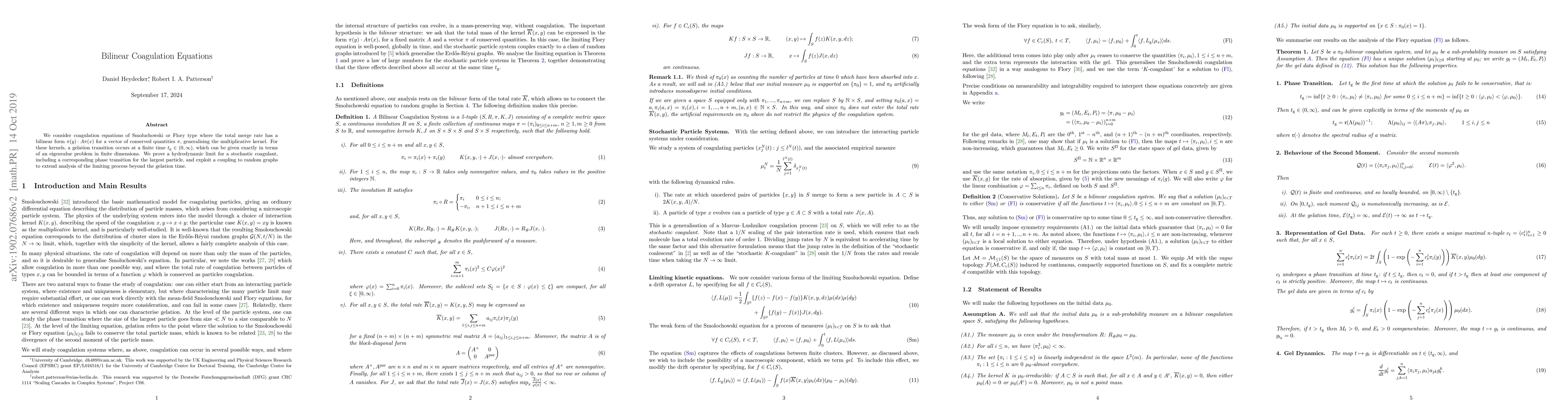 We consider coagulation equations of Smoluchowski or Flory type where the total merge rate has a bilinear form $\pi(y)\cdot A\pi(x)$ for a vector of conserved quantities $\pi$, generalising the multiplicative kernel. For these kernels, a gelation transition occurs at a finite time $t_\mathrm{g}\in (0,\infty)$, which can be given exactly in terms of an eigenvalue problem in finite dimensions. We prove a hydrodynamic limit for a stochastic coagulant, including a corresponding phase transition for the largest particle, and exploit a coupling to random graphs to extend analysis of the limiting process beyond the gelation time.