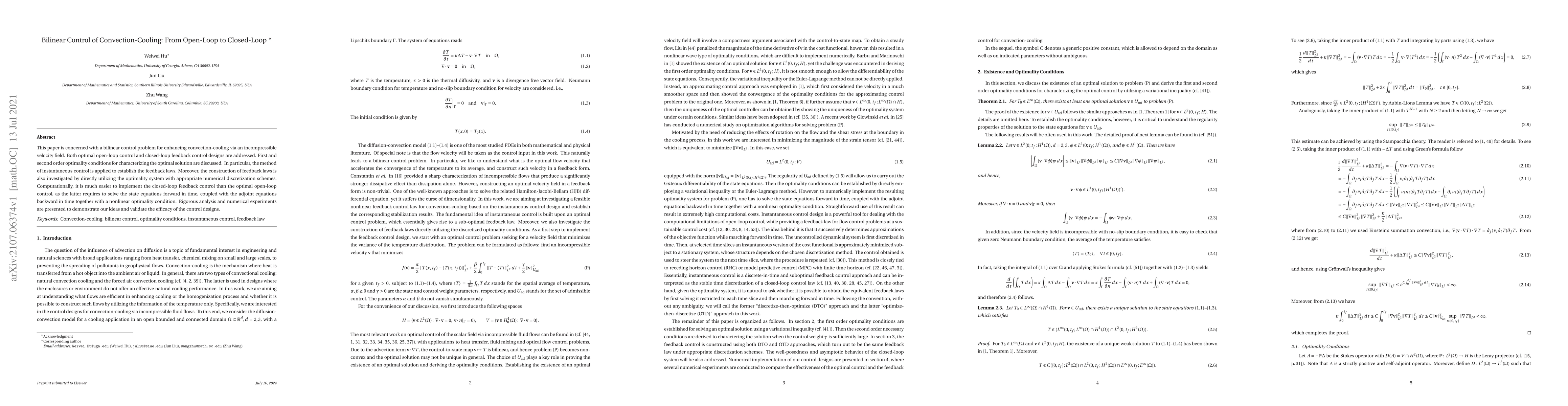 This paper explores bilinear control strategies for convection-cooling, comparing optimal open-loop and closed-loop feedback designs. It employs the method of instantaneous control and numerical discretization to construct feedback laws, demonstrating that closed-loop control is more computationally feasible than open-loop.