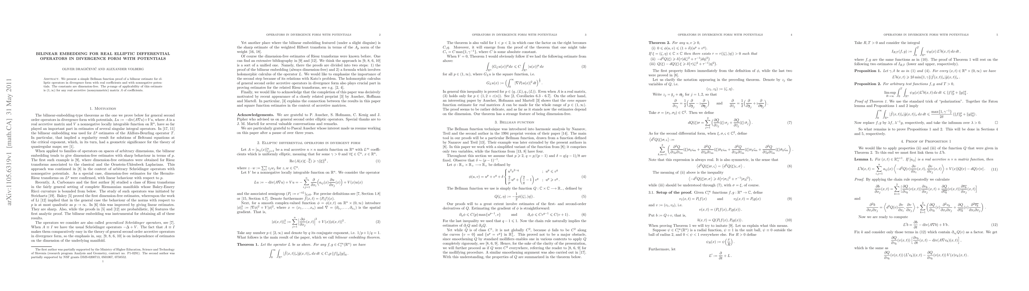 We present a simple Bellman function proof of a bilinear estimate for elliptic operators in divergence form with real coefficients and with nonnegative potentials. The constants are dimension-free. The $p$-range of applicability of this estimate is $(1,\infty)$ for any real accretive (nonsymmetric) matrix $A$ of coefficients.