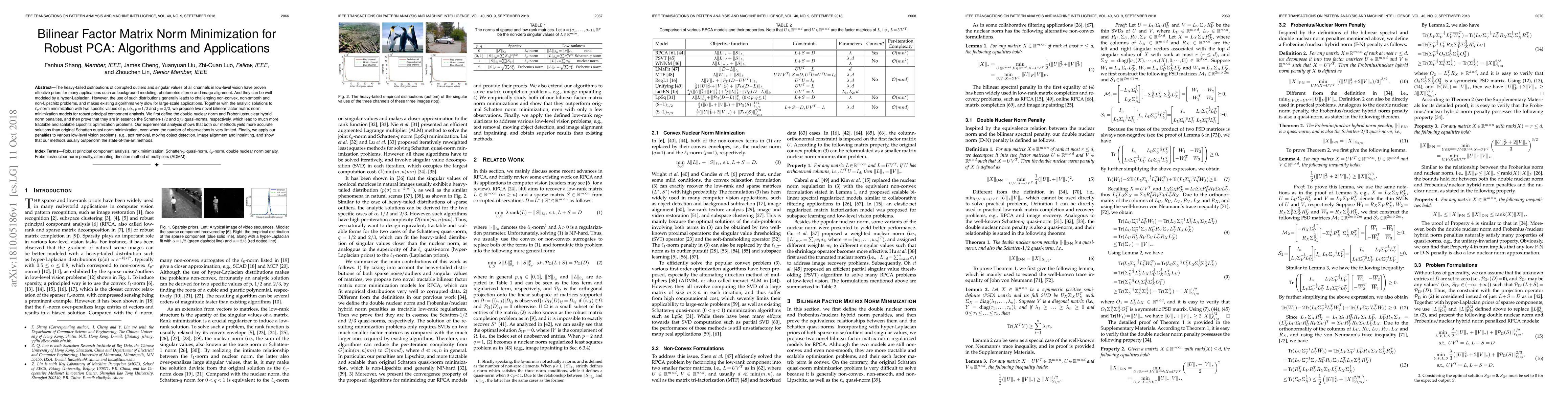 This paper proposes novel bilinear factor matrix norm minimization models for robust PCA, introducing double nuclear norm and hybrid Frobenius/nuclear penalties that simplify optimization. Experimental results show improved accuracy over traditional methods and superior performance in various low-level vision applications.