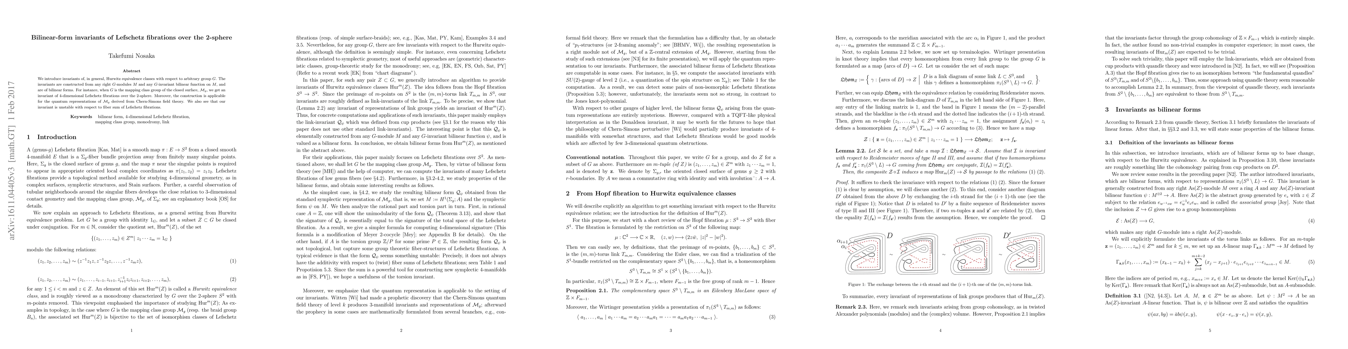 We introduce invariants of Hurwitz equivalence classes with respect to arbitrary group $G$. The invariants are constructed from any right $G$-modules $M$ and any $G$-invariant bilinear function on $M$, and are of bilinear forms. For instance, when $G$ is the mapping class group of the closed surface, $\mathcal{M}_g$, we get an invariant of 4-dimensional Lefschetz fibrations over the 2-sphere. Moreover, the construction is applicable for the quantum representations of $\mathcal{M}_g $ derived from Chern-Simons field theory. We compute the associated invariants in some cases, and find infinitely many Lefschetz fibrations which have the same Seiberg-Witten invariant and are homeomorphic but not mutually isomorphic as fibrations.