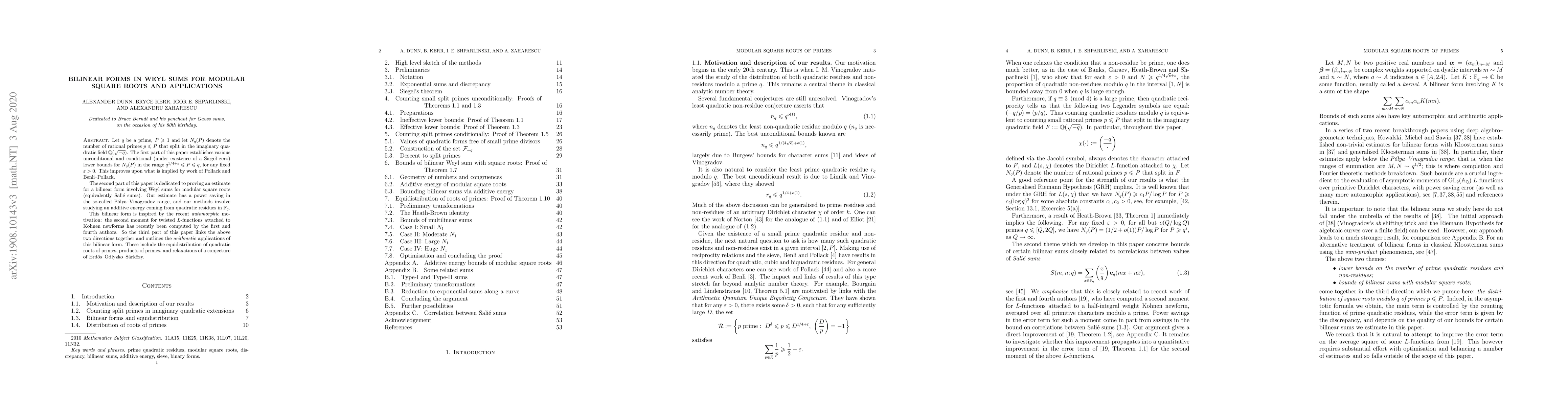 Let $q$ be a prime, $P \geq 1$ and let $N_q(P)$ denote the number of rational primes $p \leq P$ that split in the imaginary quadratic field $\mathbb{Q}(\sqrt{-q})$. The first part of this paper establishes various unconditional and conditional (under existence of a Siegel zero) lower bounds for $N_q(P)$ in the range $q^{1/4+\varepsilon} \leq P \leq q$, for any fixed $\varepsilon>0$. This improves upon what is implied by work of Pollack and Benli-Pollack. The second part of this paper is dedicated to proving an estimate for a bilinear form involving Weyl sums for modular square roots (equivalently Sali\'{e} sums). Our estimate has a power saving in the so-called P{\'o}lya-Vinogradov range, and our methods involve studying an additive energy coming from quadratic residues in $\mathbb{F}_q$. This bilinear form is inspired by the recent automorphic motivation: the second moment for twisted $L$-functions attached to Kohnen newforms has recently been computed by the first and fourth authors. So the third part of this paper links the above two directions together and outlines the arithmetic applications of this bilinear form. These include the equidistribution of quadratic roots of primes, products of primes, and relaxations of a conjecture of Erdos-Odlyzko-Sarkozy.