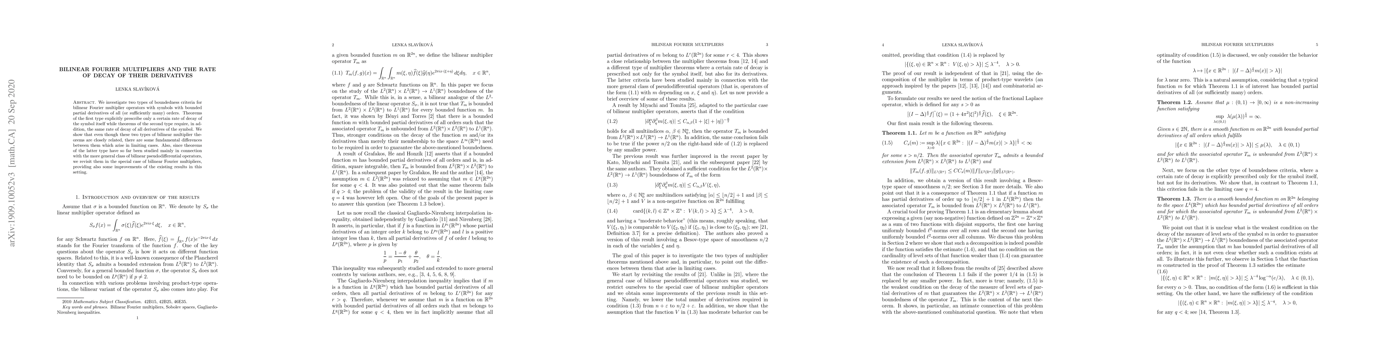 We investigate two types of boundedness criteria for bilinear Fourier multiplier operators with symbols with bounded partial derivatives of all (or sufficiently many) orders. Theorems of the first type explicitly prescribe only a certain rate of decay of the symbol itself while theorems of the second type require, in addition, the same rate of decay of all derivatives of the symbol. We show that even though these two types of bilinear multiplier theorems are closely related, there are some fundamental differences between them which arise in limiting cases. Also, since theorems of the latter type have so far been studied mainly in connection with the more general class of bilinear pseudodifferential operators, we revisit them in the special case of bilinear Fourier multipliers, providing also some improvements of the existing results in this setting.