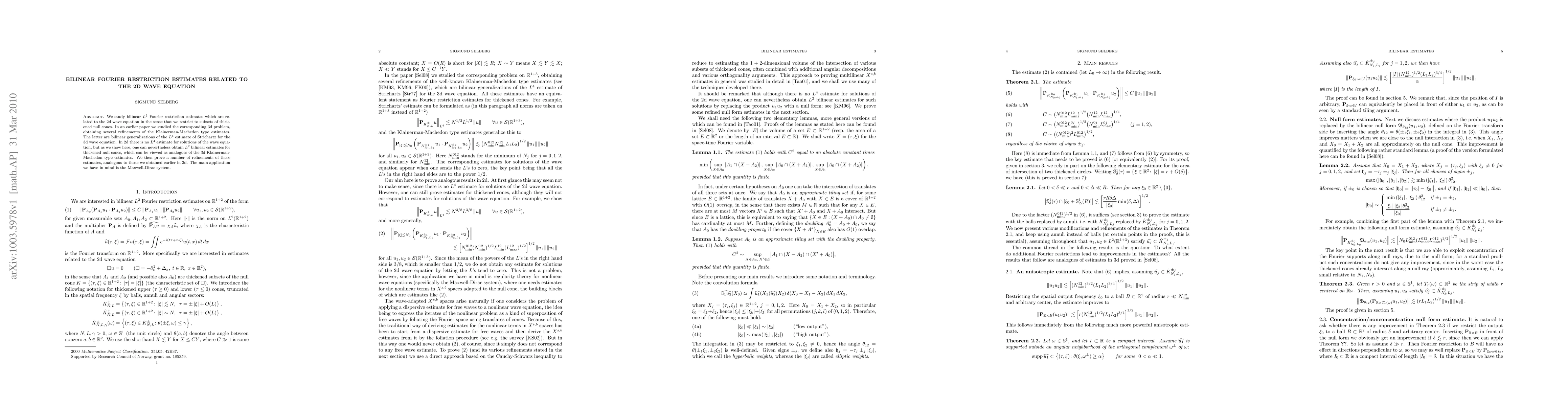 This paper investigates bilinear $L^2$ Fourier restriction estimates related to the 2d wave equation, focusing on subsets of thickened null cones. It establishes $L^2$ bilinear estimates analogous to the 3d Klainerman-Machedon type estimates, with applications to the Maxwell-Dirac system.