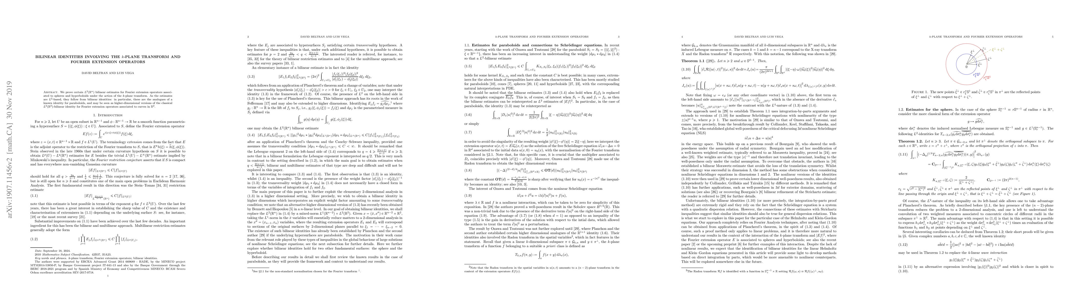 We prove certain $L^2(\mathbb{R}^n)$ bilinear estimates for Fourier extension operators associated to spheres and hyperboloids under the action of the $k$-plane transform. As the estimates are $L^2$-based, they follow from bilinear identities: in particular, these are the analogues of a known identity for paraboloids, and may be seen as higher-dimensional versions of the classical $L^2(\mathbb{R}^2)$-bilinear identity for Fourier extension operators associated to curves in $\mathbb{R}^2$.