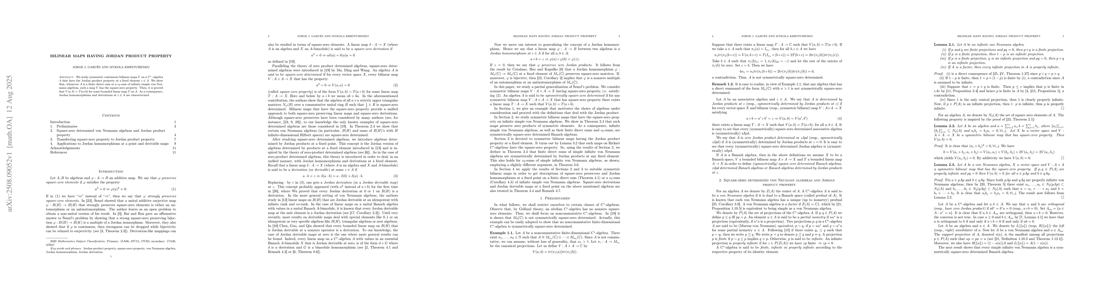 We study symmetric continuous bilinear maps $V$ on a C$^*$-algebra $A$ that have the Jordan product property at a fixed element $z\in A$. We show that, whenever $A$ is a finite direct sum or a $c_0$-sum of infinite simple von Neumann algebras, such a map $V$ has the square-zero property. Then, it is proved that $V(a,b)=T(a\circ b)$ for some bounded linear map $T$ on $A$. As a consequence, Jordan homomorphisms and derivations at $z\in A$ are characterized.