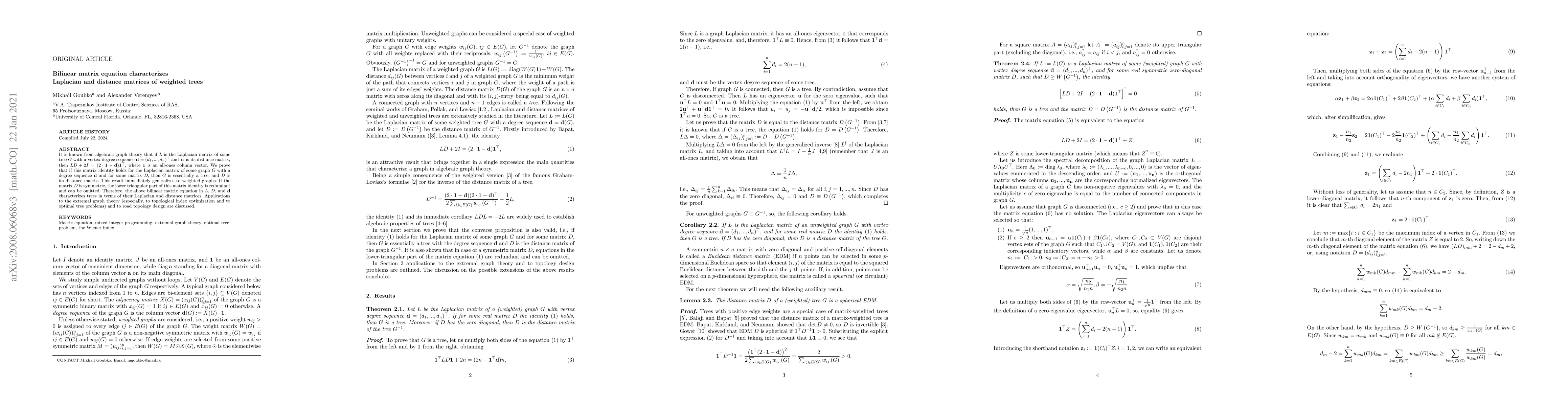 This paper proves that the bilinear matrix equation $LD+2I=(2\cdot\mathbf{1}-\mathbf{d})\mathbf{1}^\top$ characterizes the Laplacian and distance matrices of weighted trees, implying that any graph satisfying this identity must be a tree. Applications extend to extremal graph theory and road topology design.