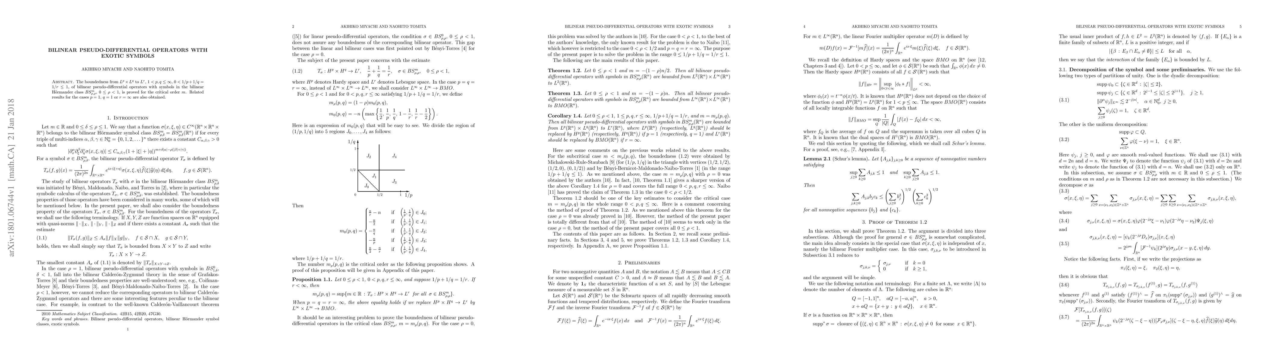 This paper proves the boundedness of bilinear pseudo-differential operators with exotic symbols in the bilinear Hörmander class for critical order $m$, mapping from $L^p \times L^q$ to $L^r$ under certain conditions. Additionally, it addresses related results for special cases where $p=1$, $q=1$, or $r=\infty$.
