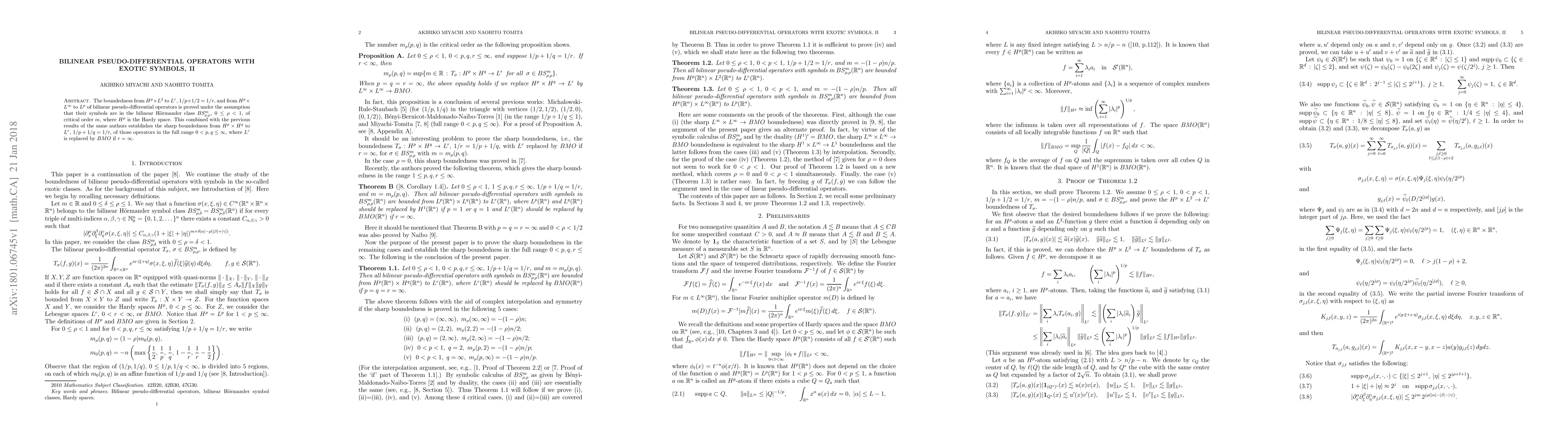 The boundedness from $H^p \times L^2$ to $L^r$, $1/p+1/2=1/r$, and from $H^p \times L^{\infty}$ to $L^p$ of bilinear pseudo-differential operators is proved under the assumption that their symbols are in the bilinear H\"ormander class $BS^m_{\rho,\rho}$, $0 \le \rho <1$, of critical order $m$, where $H^p$ is the Hardy space. This combined with the previous results of the same authors establishes the sharp boundedness from $H^p \times H^q$ to $L^r$, $1/p+1/q=1/r$, of those operators in the full range $0< p, q \le \infty$, where $L^r$ is replaced by $BMO$ if $r=\infty$.
