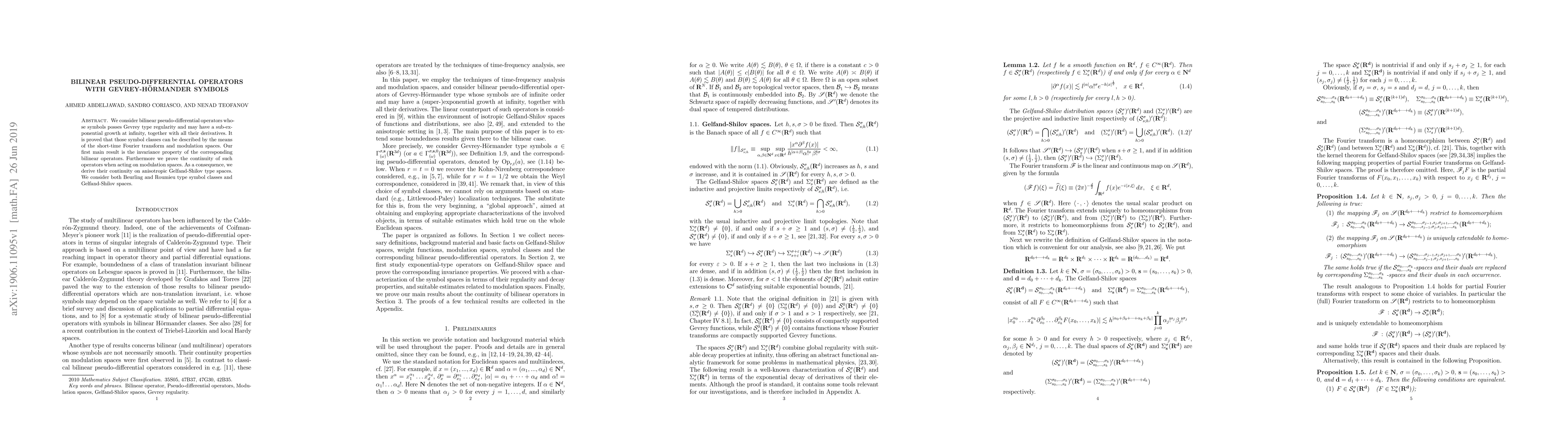 The paper employs techniques from pseudo-differential operators and Gevrey-Hörmander symbol classes, utilizing modulation spaces and short-time Fourier transforms to analyze bilinear operators.