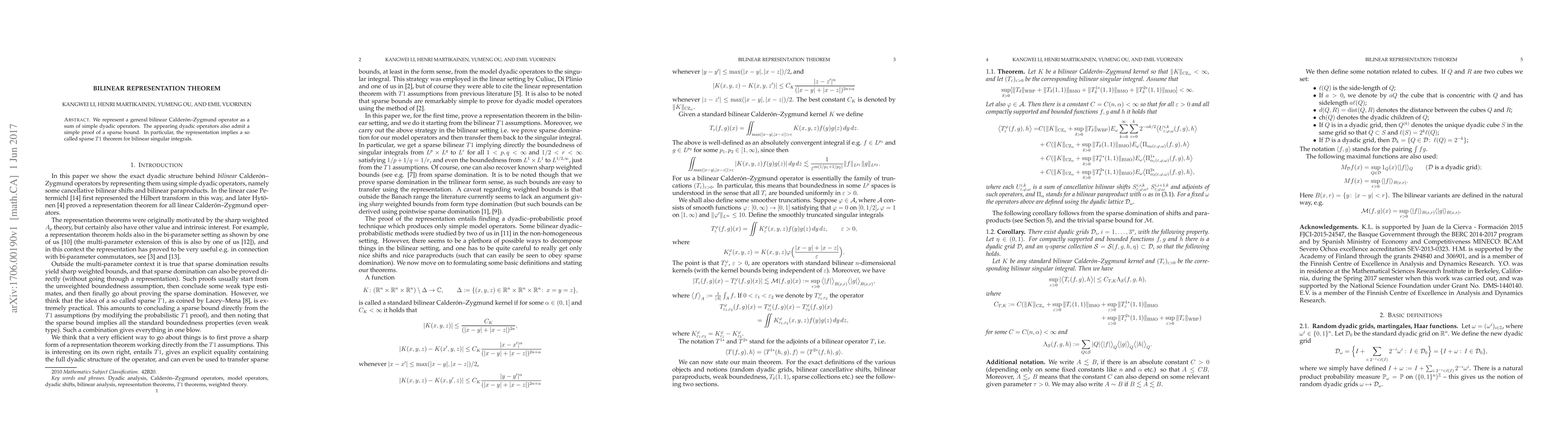 Summary: This paper represents a general bilinear Calderón-Zygmund operator as a sum of simple dyadic operators, which also allows for a straightforward proof of a sparse bound, leading to a sparse T1 theorem for bilinear singular integrals.