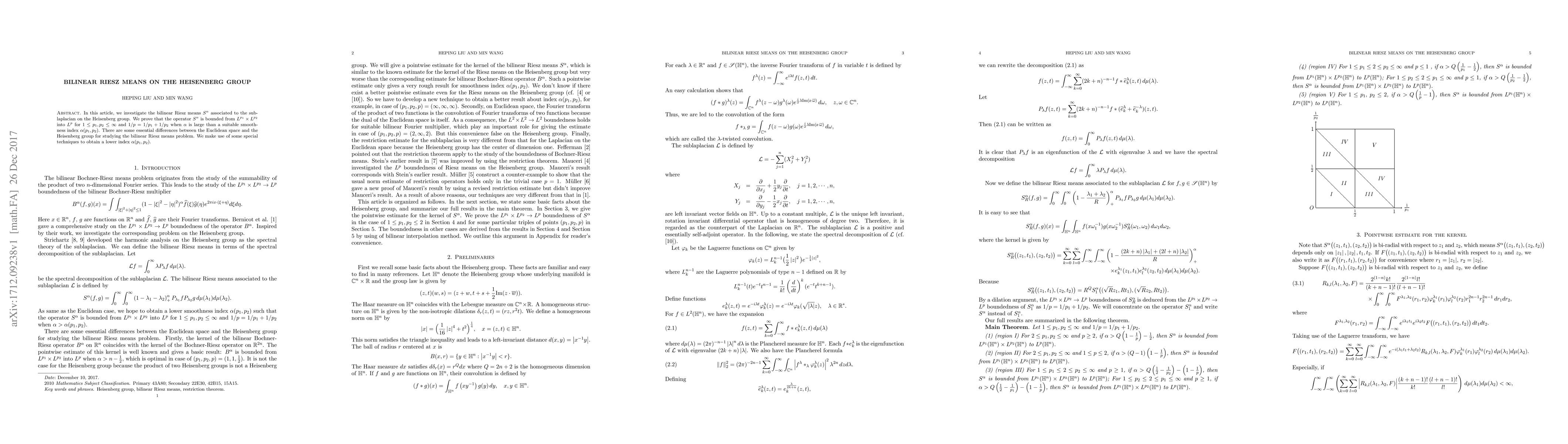 The paper investigates bilinear Riesz means associated with the sublaplacian on the Heisenberg group, employing special techniques to determine a lower smoothness index α(p₁, p₂) for boundedness.
