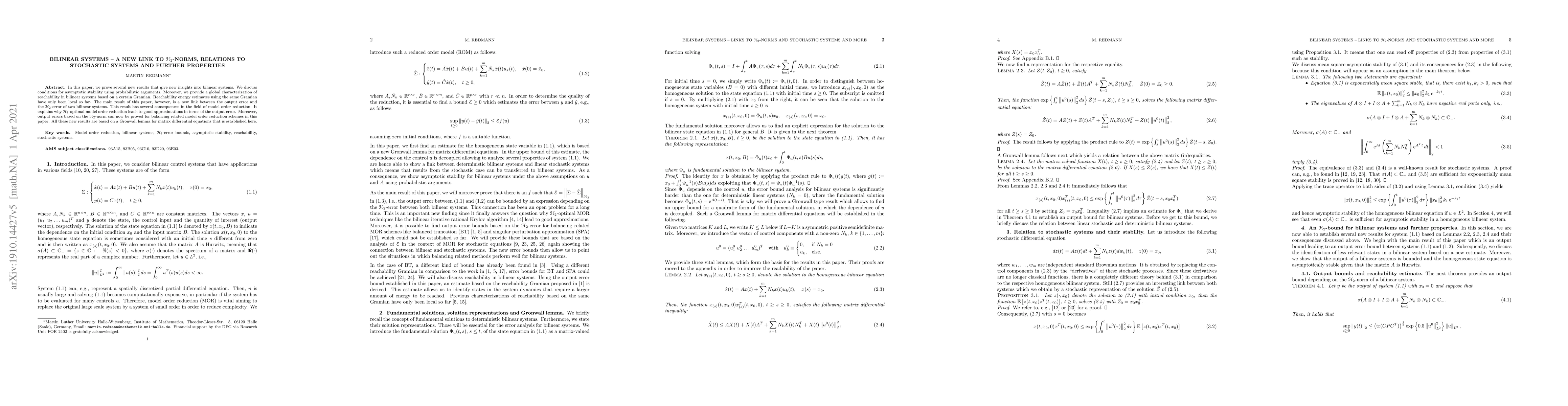 This paper presents new insights into bilinear systems, proving conditions for asymptotic stability with probabilistic arguments and a global reachability characterization via a Gramian. The main achievement is a novel link between output error and H2-error of bilinear systems, explaining H2-optimal reduction's effectiveness and enabling output error proofs for balancing-based model order reduction methods. These findings stem from a matrix differential equation Gronwall lemma established in the paper.
