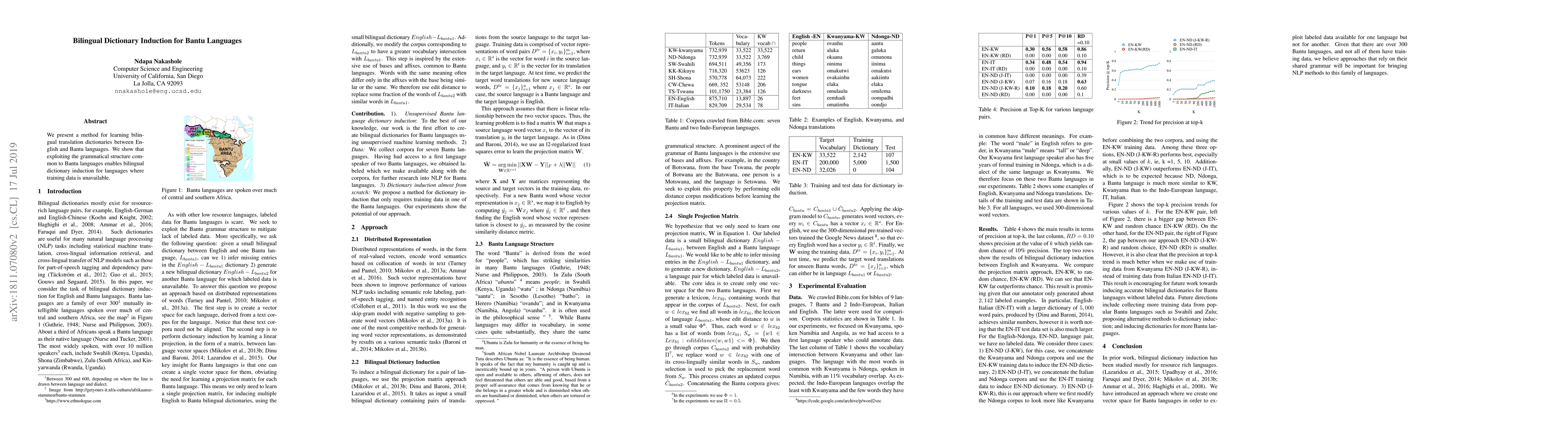 Summary: This paper proposes a method for inducing bilingual dictionaries between English and Bantu languages by leveraging shared grammatical structures, even in the absence of training data. The approach demonstrates the potential for language induction in under-resourced language pairs.