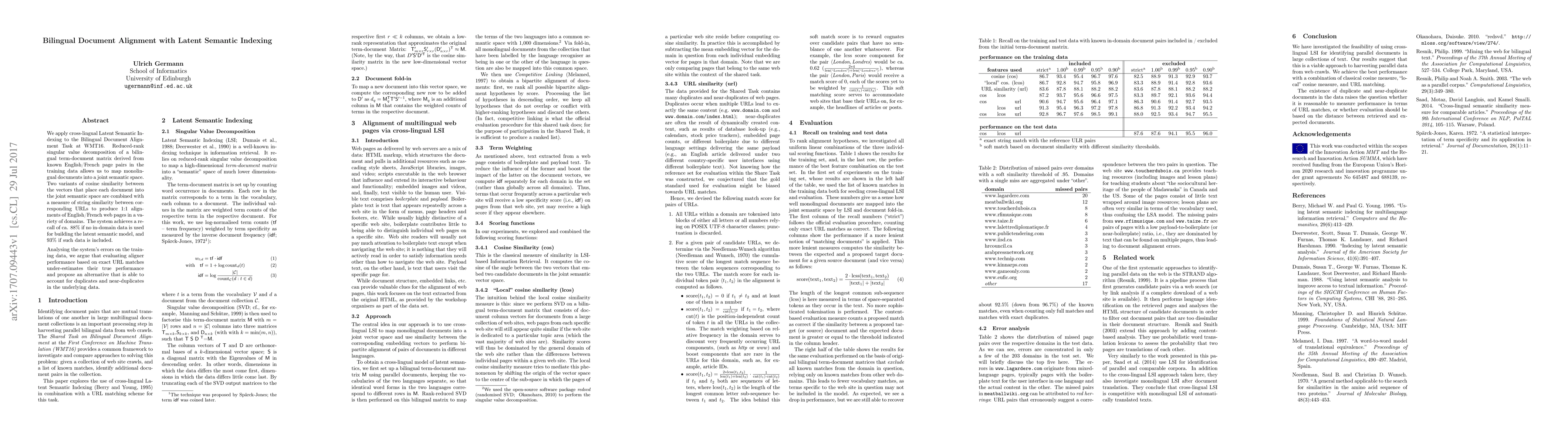 This paper proposes a method for aligning bilingual documents using Latent Semantic Indexing (LSI) and achieves high recall rates for English/French web page alignments. The authors argue that traditional evaluation metrics underestimate aligner performance and suggest a new evaluation method that accounts for duplicates and near-duplicates.
