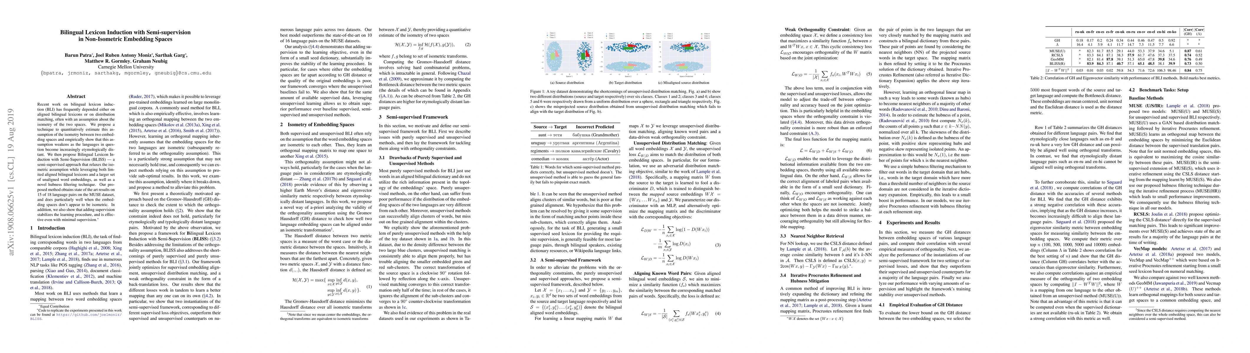 Recent work on bilingual lexicon induction (BLI) has frequently depended either on aligned bilingual lexicons or on distribution matching, often with an assumption about the isometry of the two spaces. We propose a technique to quantitatively estimate this assumption of the isometry between two embedding spaces and empirically show that this assumption weakens as the languages in question become increasingly etymologically distant. We then propose Bilingual Lexicon Induction with Semi-Supervision (BLISS) --- a semi-supervised approach that relaxes the isometric assumption while leveraging both limited aligned bilingual lexicons and a larger set of unaligned word embeddings, as well as a novel hubness filtering technique. Our proposed method obtains state of the art results on 15 of 18 language pairs on the MUSE dataset, and does particularly well when the embedding spaces don't appear to be isometric. In addition, we also show that adding supervision stabilizes the learning procedure, and is effective even with minimal supervision.