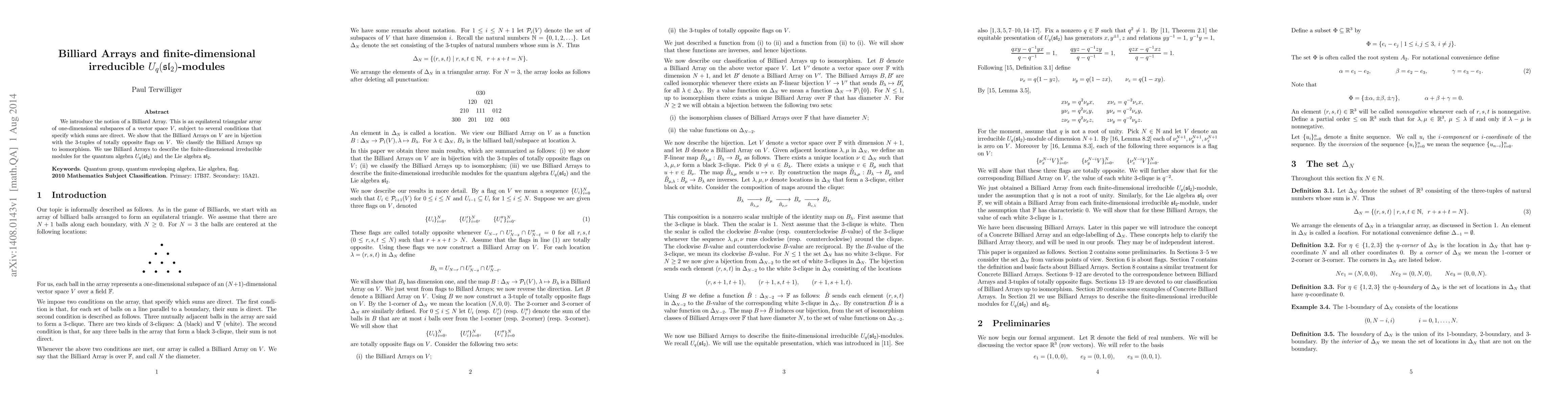 This paper introduces Billiard Arrays, triangular arrays of subspaces of a vector space, and demonstrates their bijection with triples of opposite flags. The study uses Billiard Arrays to classify them and describe finite-dimensional irreducible modules for $U_q(\mathfrak{sl}_2)$ and $\mathfrak{sl}_2$.