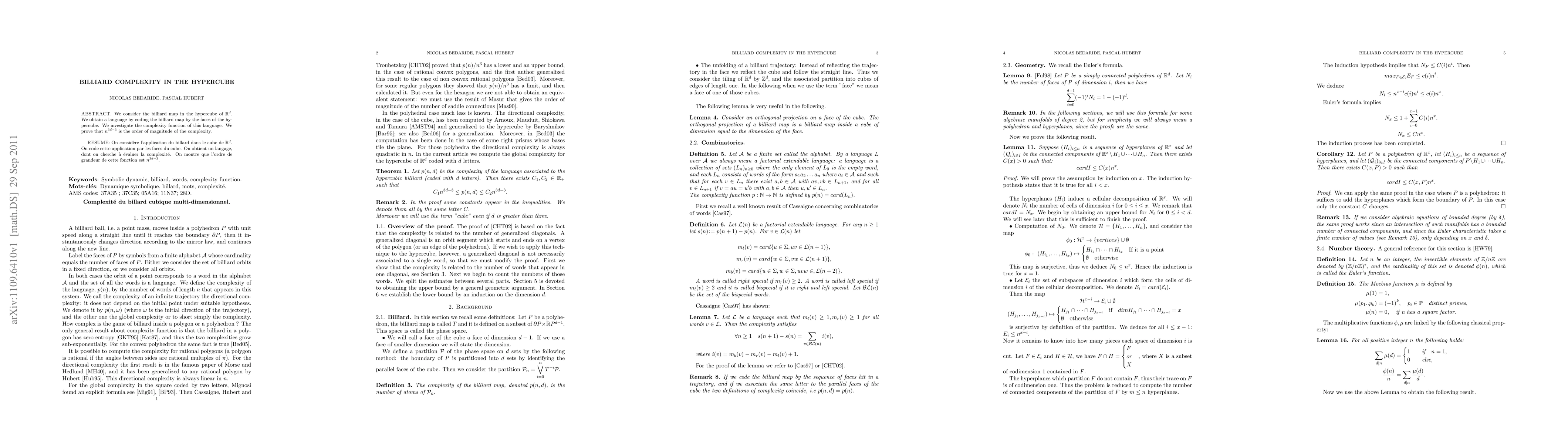 We consider the billiard map in the hypercube of $\mathbb{R}^d$. We obtain a language by coding the billiard map by the faces of the hypercube. We investigate the complexity function of this language. We prove that $n^{3d-3}$ is the order of magnitude of the complexity.