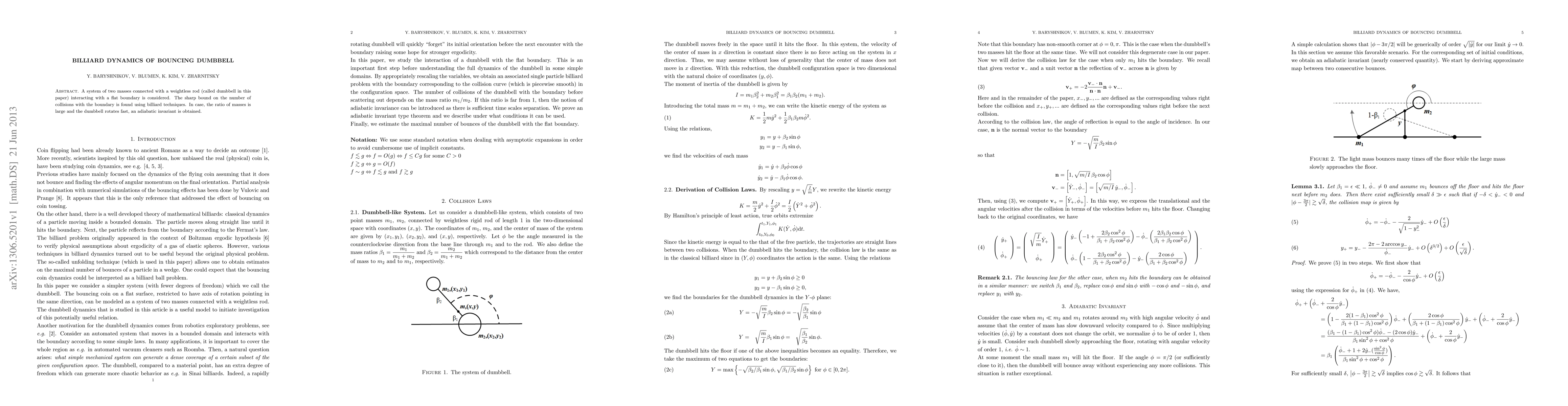 This research derives a maximum collision limit for a two-mass 'dumbbell' system interacting with a flat surface using billiard methods. In rapid, large-mass-ratio rotations, it also calculates an adiabatic invariant.