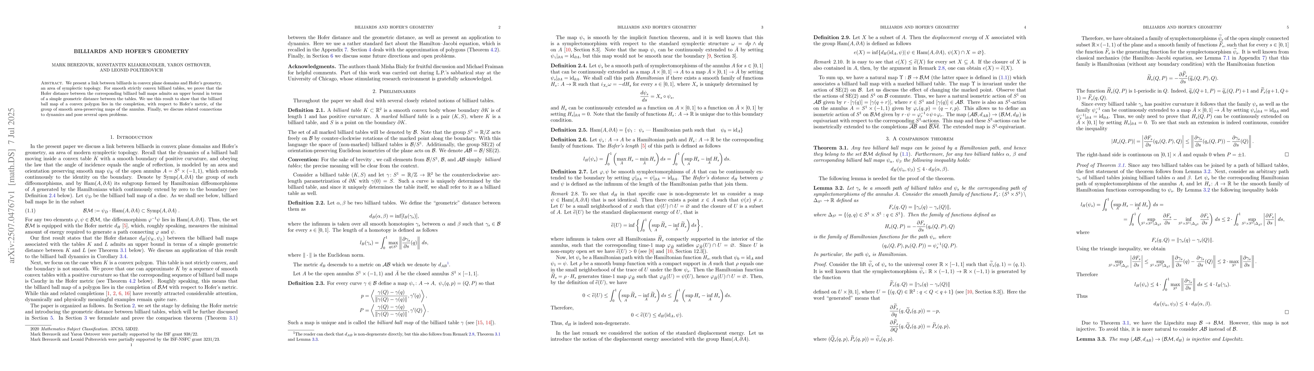 We present a link between billiards in convex plane domains and Hofer's geometry, an area of symplectic topology. For smooth strictly convex billiard tables, we prove that the Hofer distance between the corresponding billiard ball maps admits an upper bound in terms of a simple geometric distance between the tables. We use this result to show that the billiard ball map of a convex polygon lies in the completion, with respect to Hofer's metric, of the group of smooth area-preserving maps of the annulus. Finally, we discuss related connections to dynamics and pose several open problems.