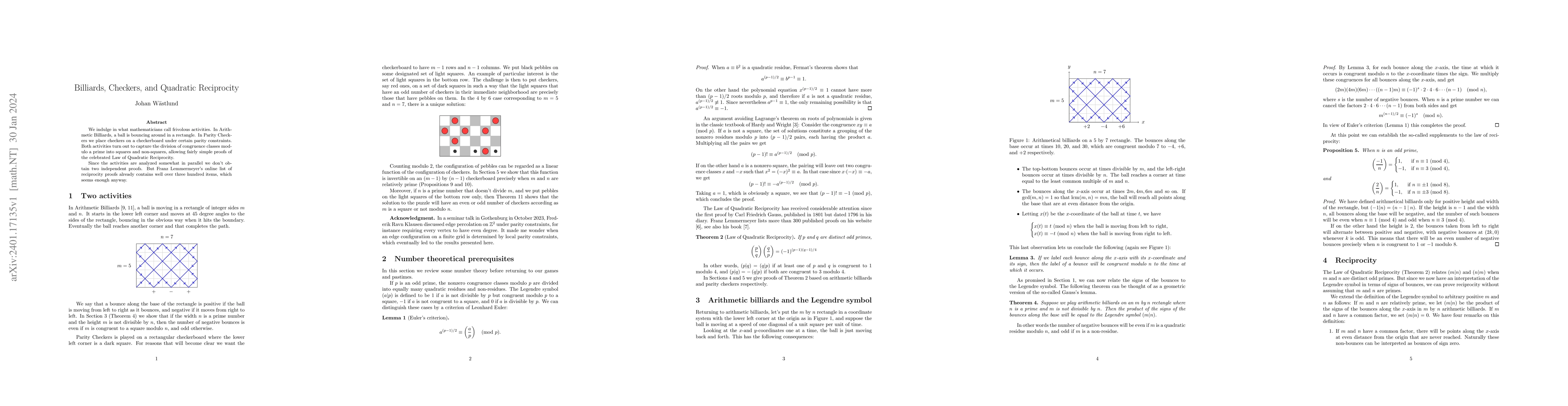 We indulge in what mathematicians call frivolous activities. In Arithmetic Billiards, a ball is bouncing around in a rectangle. In Parity Checkers we place checkers on a checkerboard under certain parity constraints. Both activities turn out to capture the division of congruence classes modulo a prime into squares and non-squares, allowing fairly simple proofs of the celebrated Law of Quadratic Reciprocity. Since the activities are analyzed somewhat in parallel we don't obtain two independent proofs. But Franz Lemmermeyer's online list of reciprocity proofs already contains well over three hundred items, which seems enough anyway.