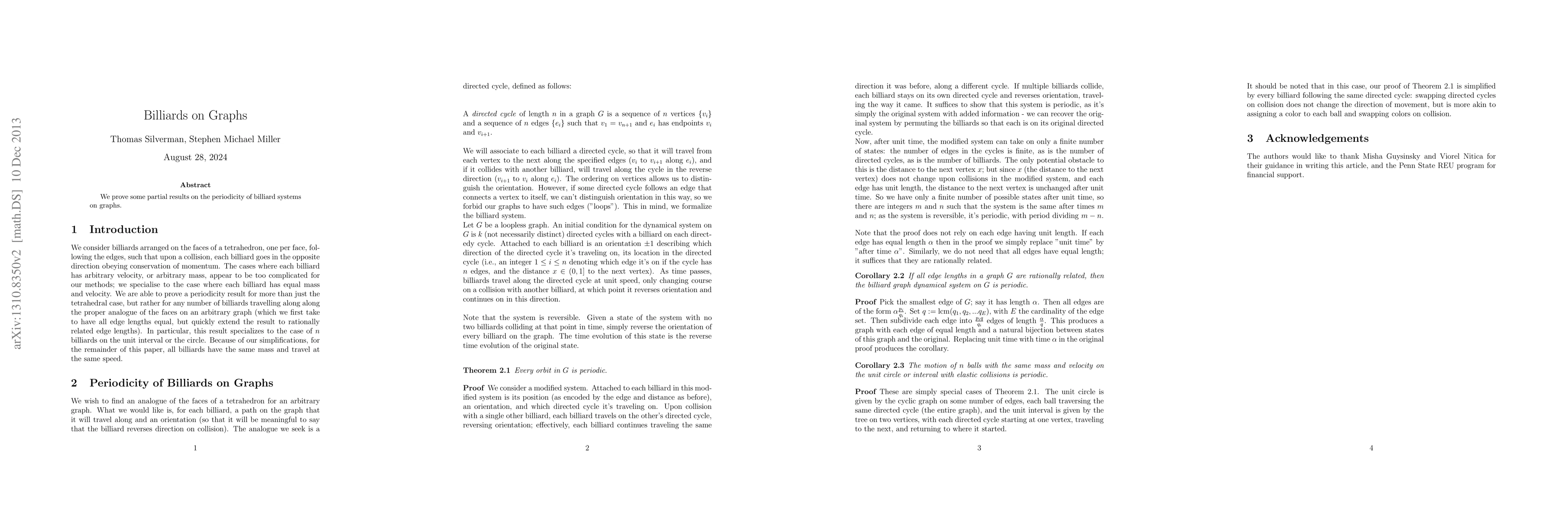 Summary: This paper investigates the periodicity of billiard systems on graphs, focusing on $n$ billiards of equal mass traveling at the same speed on the unit interval or circle, and presents partial results on their periodic behavior.