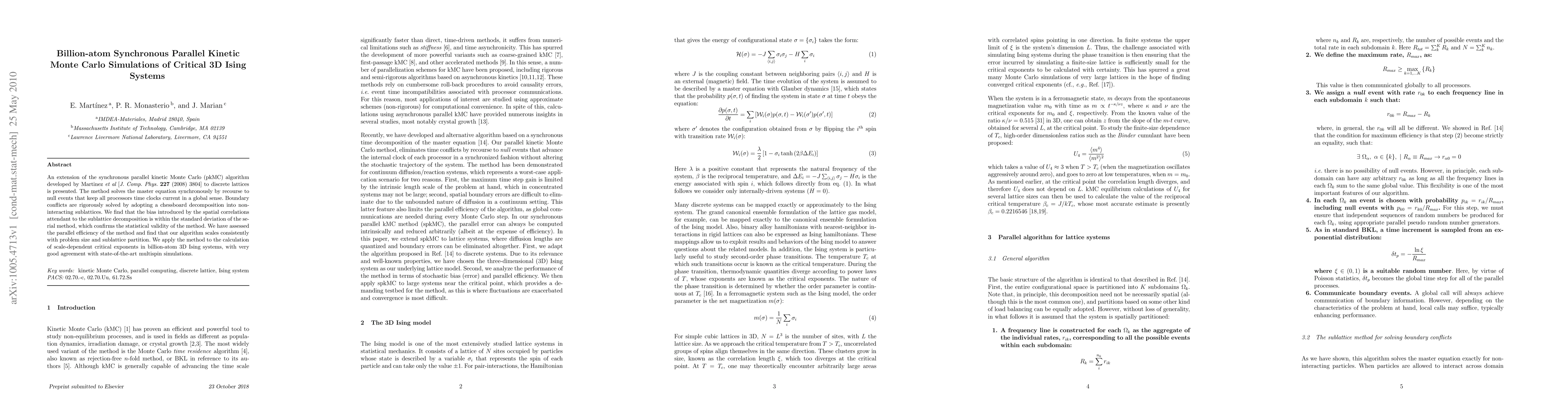 This paper extends the synchronous parallel kinetic Monte Carlo (pkMC) algorithm for simulating critical 3D Ising systems, achieving high parallel efficiency and maintaining statistical validity through rigorous boundary conflict resolution. The method shows good agreement with multispin simulations for calculating scale-dependent critical exponents in billion-atom systems.