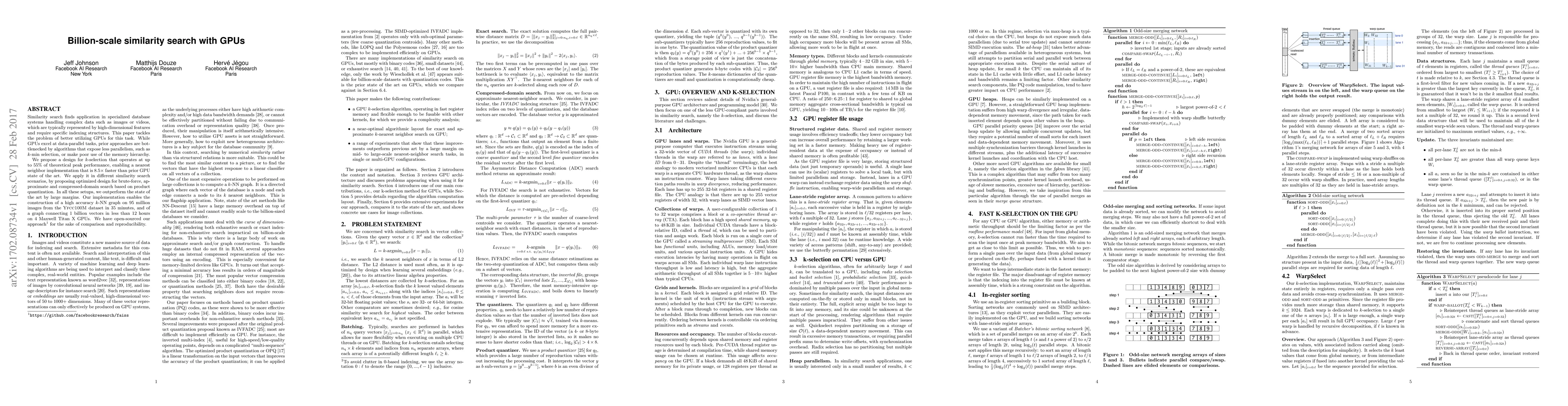 Similarity search finds application in specialized database systems handling complex data such as images or videos, which are typically represented by high-dimensional features and require specific indexing structures. This paper tackles the problem of better utilizing GPUs for this task. While GPUs excel at data-parallel tasks, prior approaches are bottlenecked by algorithms that expose less parallelism, such as k-min selection, or make poor use of the memory hierarchy. We propose a design for k-selection that operates at up to 55% of theoretical peak performance, enabling a nearest neighbor implementation that is 8.5x faster than prior GPU state of the art. We apply it in different similarity search scenarios, by proposing optimized design for brute-force, approximate and compressed-domain search based on product quantization. In all these setups, we outperform the state of the art by large margins. Our implementation enables the construction of a high accuracy k-NN graph on 95 million images from the Yfcc100M dataset in 35 minutes, and of a graph connecting 1 billion vectors in less than 12 hours on 4 Maxwell Titan X GPUs. We have open-sourced our approach for the sake of comparison and reproducibility.