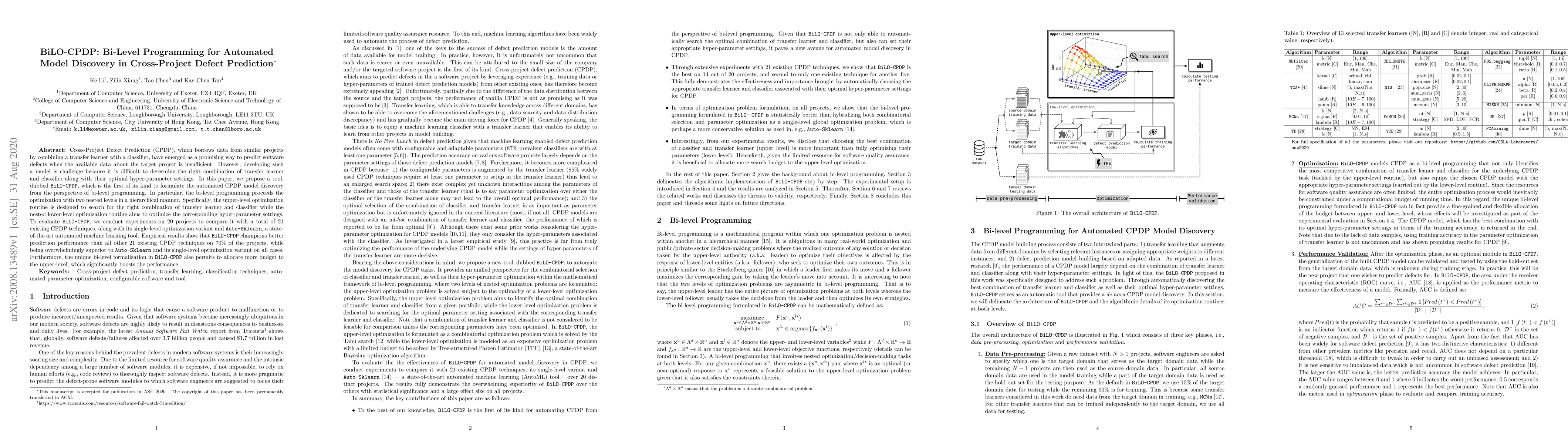 BiLO-CPDP introduces a novel bi-level programming approach for automated model discovery in Cross-Project Defect Prediction, optimizing both the combination of transfer learners and classifiers and their hyperparameter settings. Experimental results demonstrate superior performance over 21 existing CPDP techniques and Auto-Sklearn, highlighting the effectiveness of its bi-level optimization strategy.