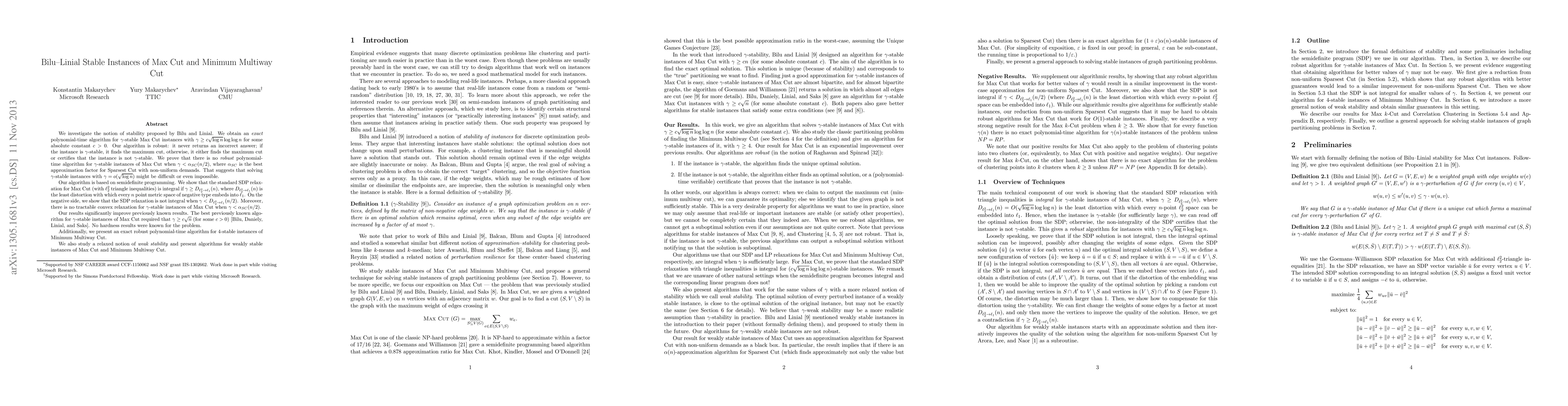 We investigate the notion of stability proposed by Bilu and Linial. We obtain an exact polynomial-time algorithm for $\gamma$-stable Max Cut instances with $\gamma \geq c\sqrt{\log n}\log\log n$ for some absolute constant $c > 0$. Our algorithm is robust: it never returns an incorrect answer; if the instance is $\gamma$-stable, it finds the maximum cut, otherwise, it either finds the maximum cut or certifies that the instance is not $\gamma$-stable. We prove that there is no robust polynomial-time algorithm for $\gamma$-stable instances of Max Cut when $\gamma < \alpha_{SC}(n/2)$, where $\alpha_{SC}$ is the best approximation factor for Sparsest Cut with non-uniform demands. Our algorithm is based on semidefinite programming. We show that the standard SDP relaxation for Max Cut (with $\ell_2^2$ triangle inequalities) is integral if $\gamma \geq D_{\ell_2^2\to \ell_1}(n)$, where $D_{\ell_2^2\to \ell_1}(n)$ is the least distortion with which every $n$ point metric space of negative type embeds into $\ell_1$. On the negative side, we show that the SDP relaxation is not integral when $\gamma < D_{\ell_2^2\to \ell_1}(n/2)$. Moreover, there is no tractable convex relaxation for $\gamma$-stable instances of Max Cut when $\gamma < \alpha_{SC}(n/2)$. That suggests that solving $\gamma$-stable instances with $\gamma =o(\sqrt{\log n})$ might be difficult or impossible. Our results significantly improve previously known results. The best previously known algorithm for $\gamma$-stable instances of Max Cut required that $\gamma \geq c\sqrt{n}$ (for some $c > 0$) [Bilu, Daniely, Linial, and Saks]. No hardness results were known for the problem. Additionally, we present an algorithm for 4-stable instances of Minimum Multiway Cut. We also study a relaxed notion of weak stability.