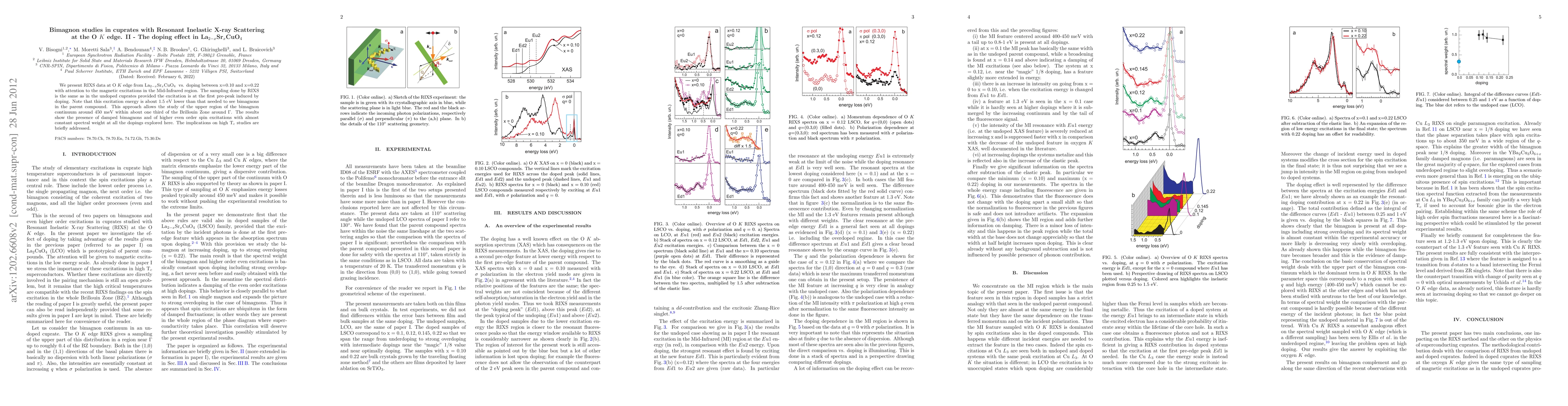 We present RIXS data at O K edge from La2-xSrxCuO4 vs. doping between x=0.10 and x=0.22 with attention to the magnetic excitations in the Mid-Infrared region. The sampling done by RIXS is the same as in the undoped cuprates provided the excitation is at the first pre-peak induced by doping. Note that this excitation energy is about 1.5 eV lower than that needed to see bimagnons in the parent compound. This approach allows the study of the upper region of the bimagnon continuum around 450 meV within about one third of the Brilluoin Zone around \Gamma. The results show the presence of damped bimagnons and of higher even order spin excitations with almost constant spectral weight at all the dopings explored here. The implications on high Tc studies are briefly addressed.