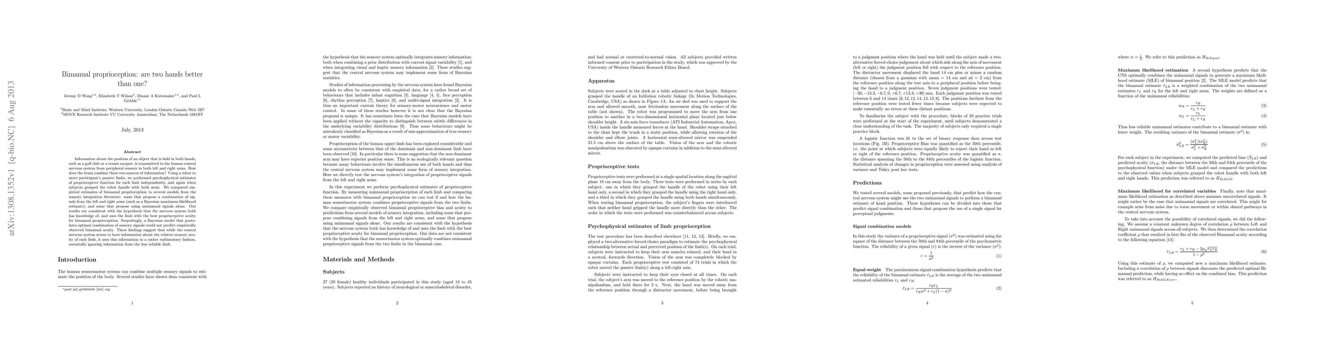 Information about the position of an object that is held in both hands, such as a golf club or a tennis racquet, is transmitted to the human central nervous system from peripheral sensors in both left and right arms. How does the brain combine these two sources of information? Using a robot to move participant's passive limbs, we performed psychophysical estimates of proprioceptive function for each limb independently, and again when subjects grasped the robot handle with both arms. We compared empirical estimates of bimanual proprioception to several models from the sensory integration literature: some that propose a combination of signals from the left and right arms (such as a Bayesian maximum-likelihood estimate), and some that propose using unimanual signals alone. Our results are consistent with the hypothesis that the nervous system both has knowledge of, and uses the limb with the best proprioceptive acuity for bimanual proprioception. Surprisingly, a Bayesian model that postulates optimal combination of sensory signals could not predict empirically observed bimanual acuity. These findings suggest that while the central nervous system seems to have information about the relative sensory acuity of each limb, it uses this information in a rather rudimentary fashion, essentially ignoring information from the less reliable limb.