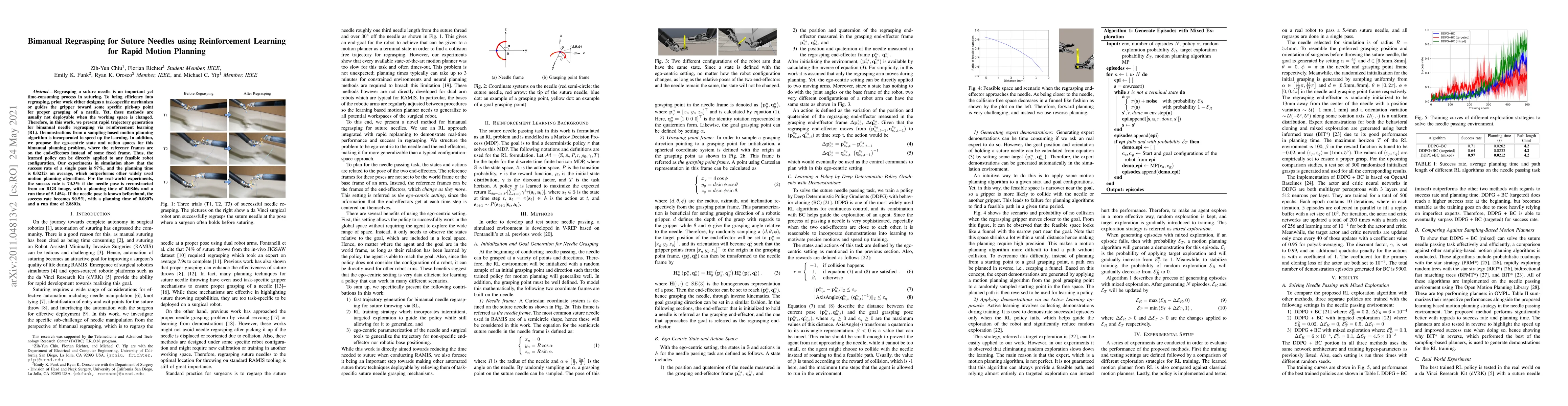 A new method using reinforcement learning generates efficient bimanual regrasping trajectories for suturing needles, achieving a 97% success rate in simulation and 73.3% in real-world experiments with known needle poses.
