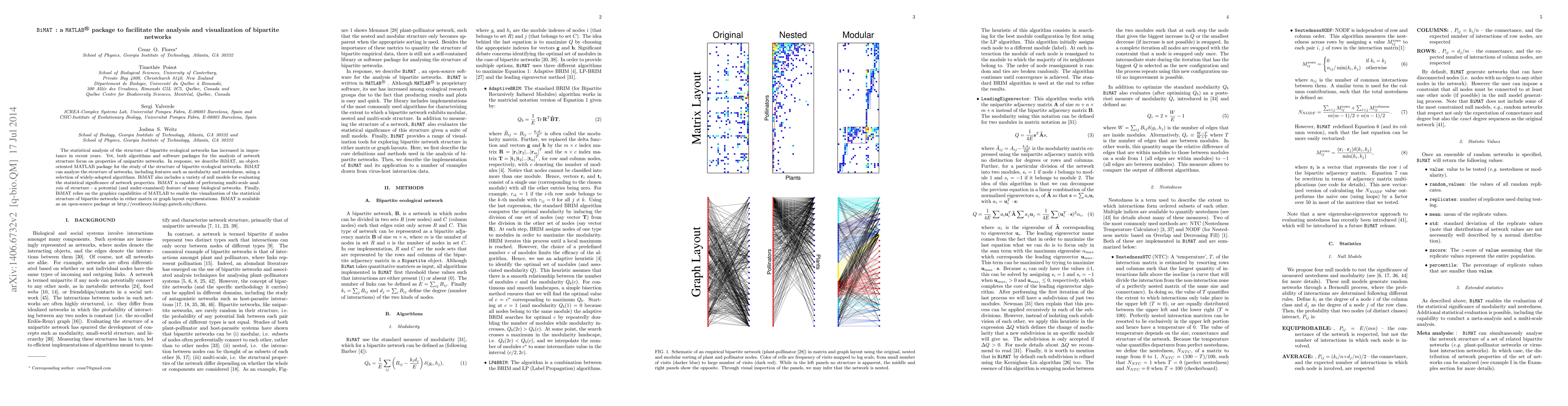 BiMAT is a MATLAB package designed for the analysis and visualization of bipartite ecological networks, offering tools for examining network structure, modularity, nestedness, and statistical significance through null models. It also supports multi-scale analysis and visualization of bipartite networks.