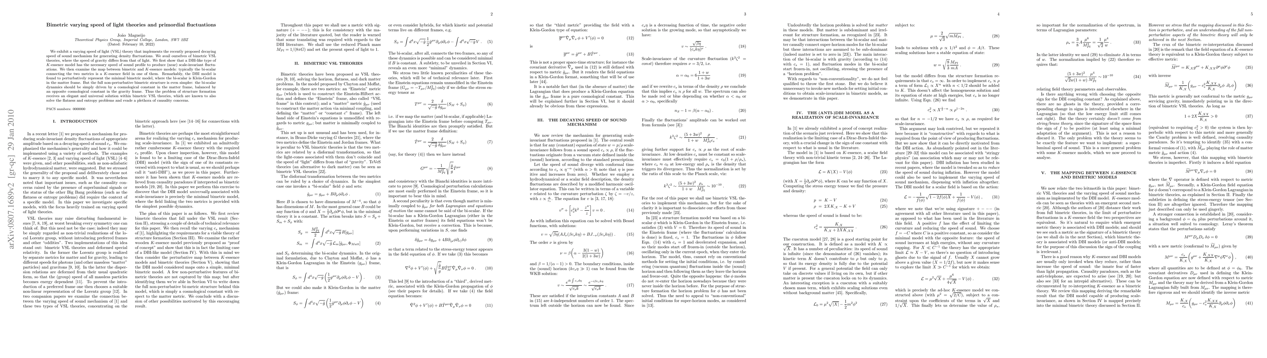 We exhibit a varying speed of light (VSL) theory that implements the recently proposed decaying speed of sound mechanism for generating density fluctuations. We avail ourselves of bimetric VSL theories, where the speed of gravity differs from that of light. We first show that a Dirac-Born-Infeld (DBI) type of $K$-essence has the necessary speed of sound profile to produce (near) scale-invariant fluctuations. We then examine the map between bimetric and $K$-essence models: typically the bi-scalar connecting the two metrics is a $K$-essence field in one of them. Remarkably, the DBI model is found to perturbatively represent the minimal bimetric model, where the bi-scalar is Klein-Gordon in the matter frame. But the full non-perturbative bimetric structure is even simpler: the bi-scalar dynamics should be simply driven by a cosmological constant in the matter frame, balanced by an opposite cosmological constant in the gravity frame. Thus the problem of structure formation receives an elegant and universal solution within bimetric VSL theories, which are known to also solve the flatness and entropy problems and evade a plethora of causality concerns.