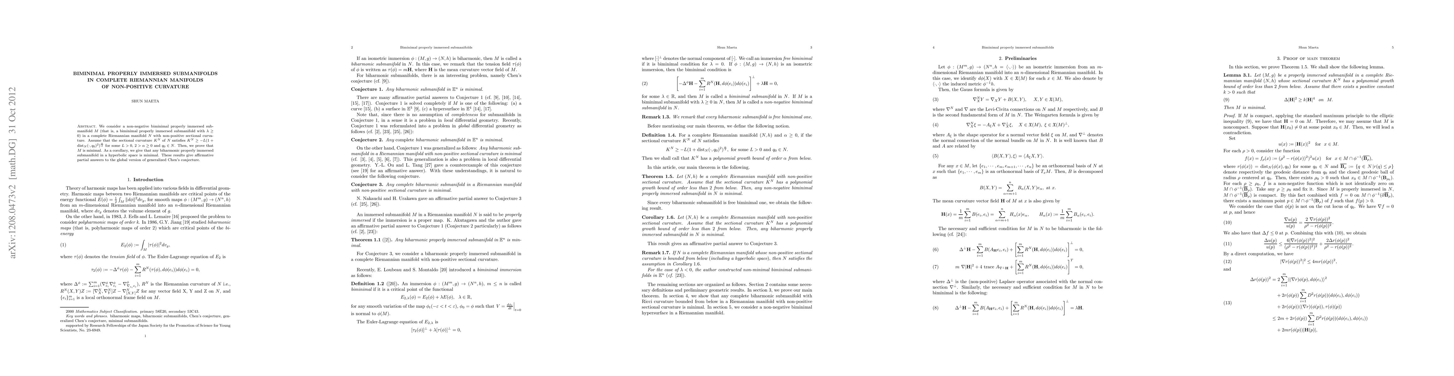 This paper investigates biminimal properly immersed submanifolds in complete Riemannian manifolds with non-positive curvature, proving that such submanifolds are minimal under certain curvature conditions. It also supports the global version of generalized Chen's conjecture by showing that any biharmonic properly immersed submanifold in hyperbolic space is minimal.