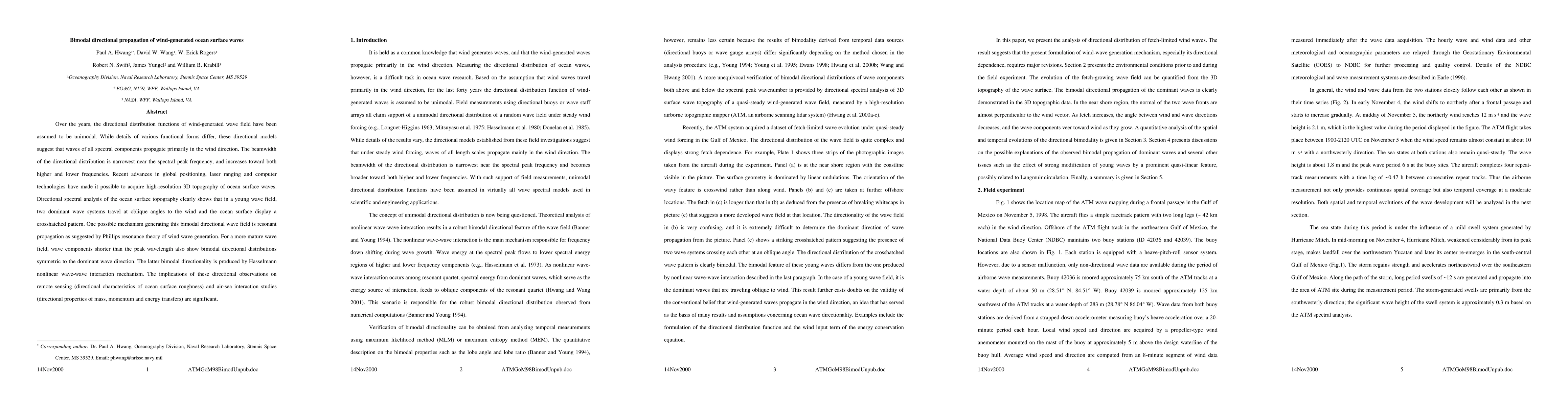 Over the years, the directional distribution functions of wind-generated wave field have been assumed to be unimodal. While details of various functional forms differ, these directional models suggest that waves of all spectral components propagate primarily in the wind direction. The beamwidth of the directional distribution is narrowest near the spectral peak frequency, and increases toward both higher and lower frequencies. Recent advances in global positioning, laser ranging and computer technologies have made it possible to acquire high-resolution 3D topography of ocean surface waves. Directional spectral analysis of the ocean surface topography clearly shows that in a young wave field, two dominant wave systems travel at oblique angles to the wind and the ocean surface display a crosshatched pattern. One possible mechanism generating this bimodal directional wave field is resonant propagation as suggested by Phillips resonance theory of wind wave generation. For a more mature wave field, wave components shorter than the peak wavelength also show bimodal directional distributions symmetric to the dominant wave direction. The latter bimodal directionality is produced by Hasselmann nonlinear wave-wave interaction mechanism. The implications of these directional observations on remote sensing (directional characteristics of ocean surface roughness) and air-sea interaction studies (directional properties of mass, momentum and energy transfers) are significant.