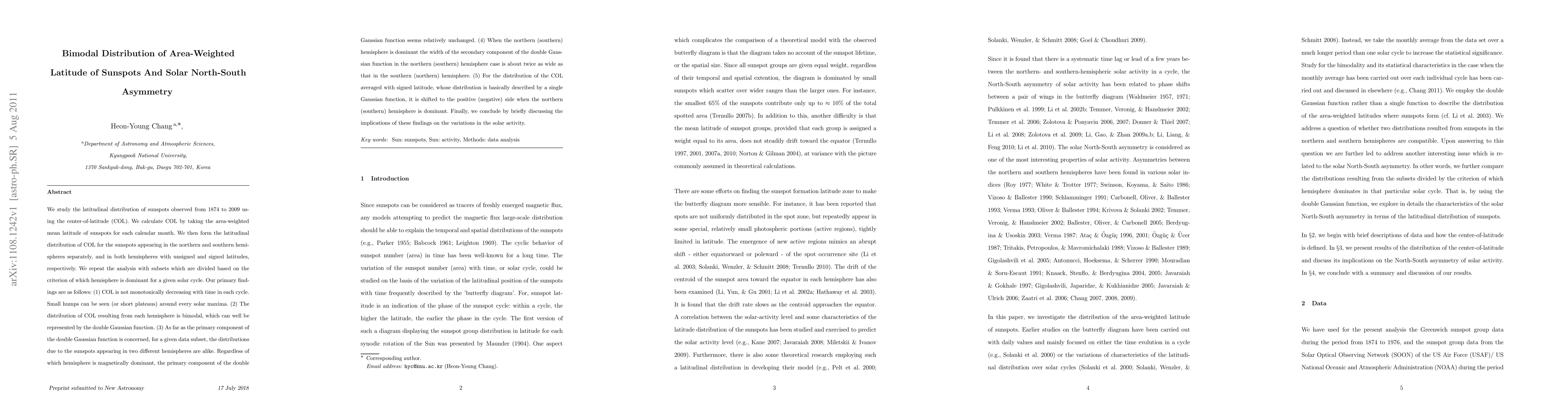 This study investigates the latitudinal distribution of sunspots from 1874 to 2009, revealing a bimodal distribution represented by a double Gaussian function. The primary component remains consistent regardless of hemisphere dominance, while the secondary component's width varies, being twice as wide in the dominant hemisphere.