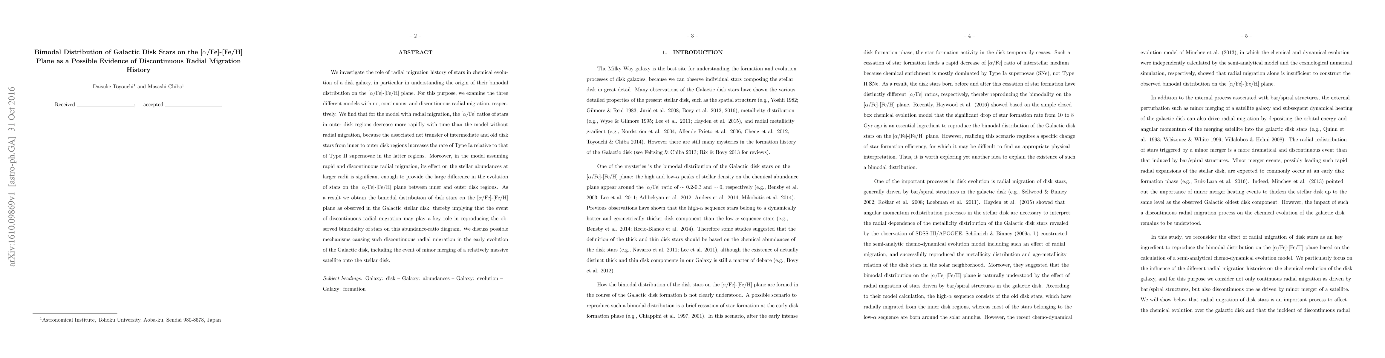 This paper explores the impact of radial migration on the chemical evolution of a disk galaxy, finding that a discontinuous radial migration history can reproduce the observed bimodal distribution of stars on the [alpha/Fe]-[Fe/H] plane. The study suggests that such migration may have been driven by early minor merging events.