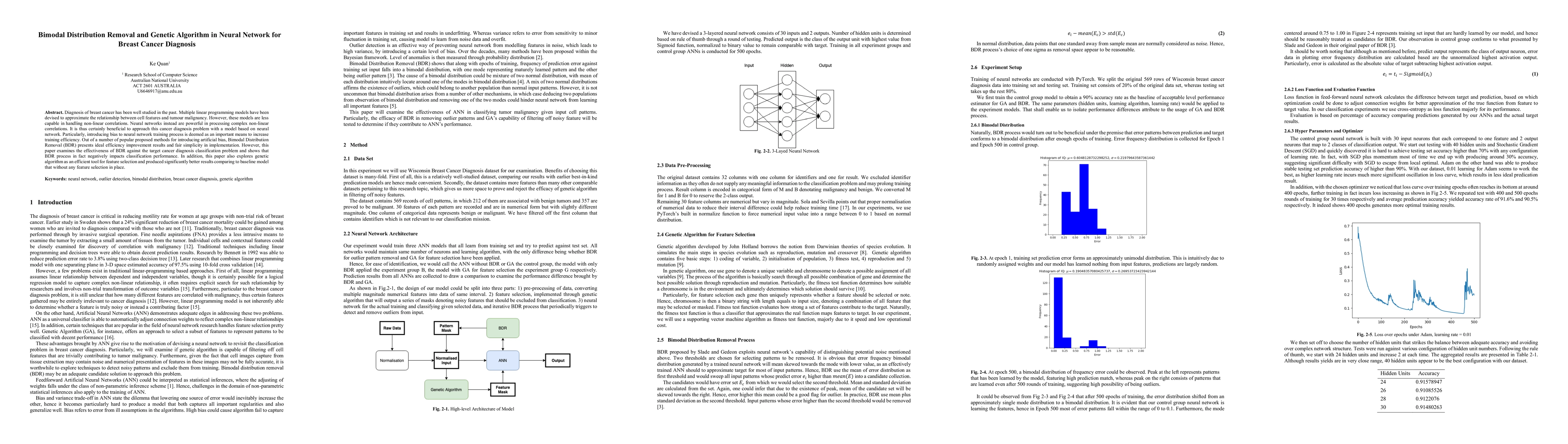 This paper investigates the use of neural networks for breast cancer diagnosis, finding that Bimodal Distribution Removal (BDR) negatively impacts classification performance. It also explores genetic algorithms for feature selection, demonstrating significantly better results compared to a baseline model without feature selection.