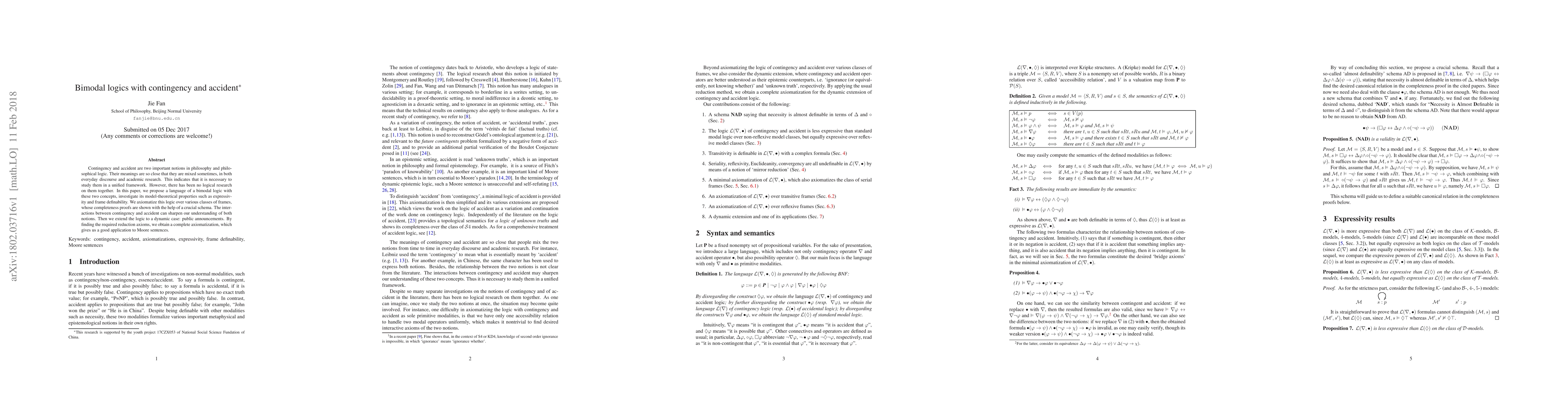 Contingency and accident are two important notions in philosophy and philosophical logic. Their meanings are so close that they are mixed sometimes, in both everyday discourse and academic research. This indicates that it is necessary to study them in a unified framework. However, there has been no logical research on them together. In this paper, we propose a language of a bimodal logic with these two concepts, investigate its model-theoretical properties such as expressivity and frame definability. We axiomatize this logic over various classes of frames, whose completeness proofs are shown with the help of a crucial schema. The interactions between contingency and accident can sharpen our understanding of both notions. Then we extend the logic to a dynamic case: public announcements. By finding the required reduction axioms, we obtain a complete axiomatization, which gives us a good application to Moore sentences.