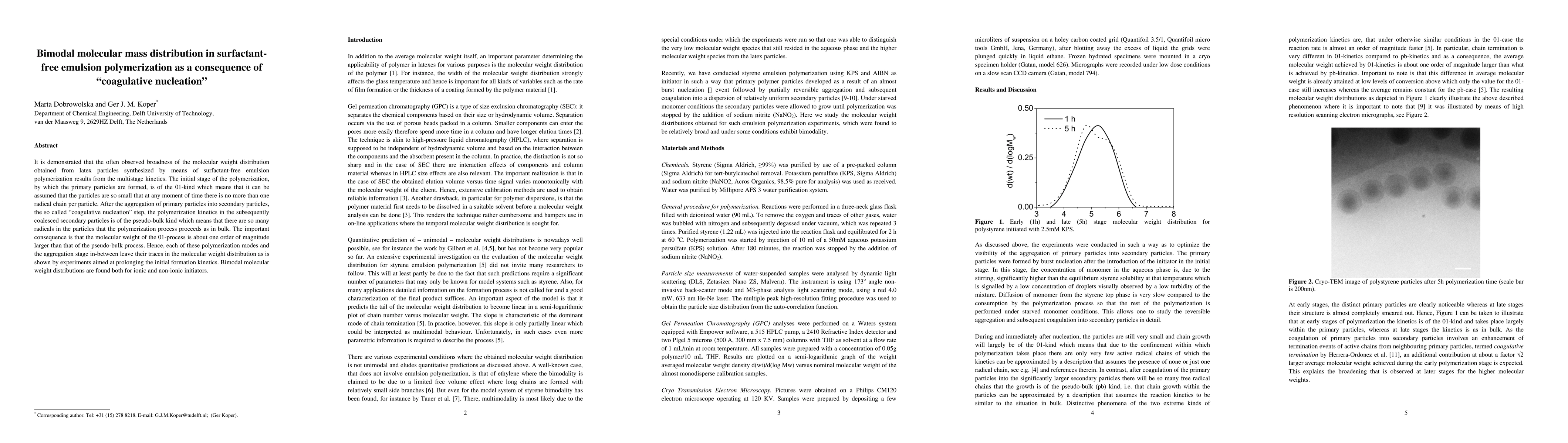 It is demonstrated that the often observed broadness of the molecular weight distribution obtained from latex particles synthesized by means of surfactant-free emulsion polymerization results from the multistage kinetics. The initial stage of the polymerization, by which the primary particles are formed, is of the 01-kind which means that it can be assumed that the particles are so small that at any moment of time there is no more than one radical chain per particle. After the aggregation of primary particles into secondary particles, the so called coagulative nucleation step, the polymerization kinetics in the subsequently coalesced secondary particles is of the pseudo-bulk kind which means that there are so many radicals in the particles that the polymerization process proceeds as in bulk. The important consequence is that the molecular weight of the 01-process is about one order of magnitude larger than that of the pseudo-bulk process. Hence, each of these polymerization modes and the aggregation stage in-between leave their traces in the molecular weight distribution as is shown by experiments aimed at prolonging the initial formation kinetics. Bimodal molecular weight distributions are found both for ionic and non-ionic initiators.