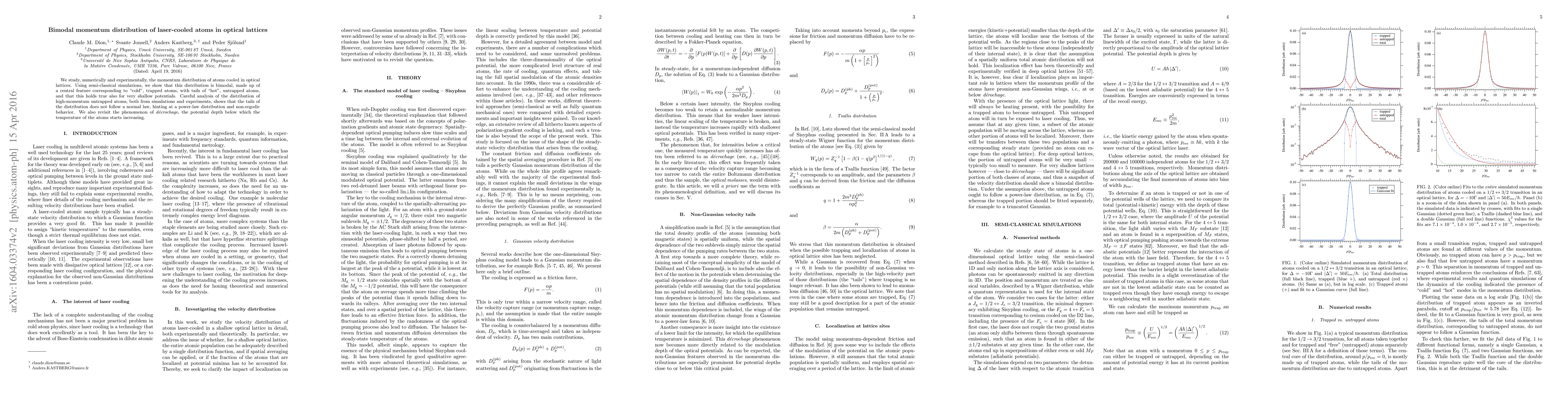 This paper investigates the bimodal momentum distribution of laser-cooled atoms in optical lattices, revealing a central peak of "cold" trapped atoms and tails of "hot" untrapped atoms. Both numerical simulations and experiments indicate a non-normal distribution of high-momentum atoms, suggesting power-law behavior and non-ergodic dynamics, along with a re-examination of the d\'ecrochage phenomenon.