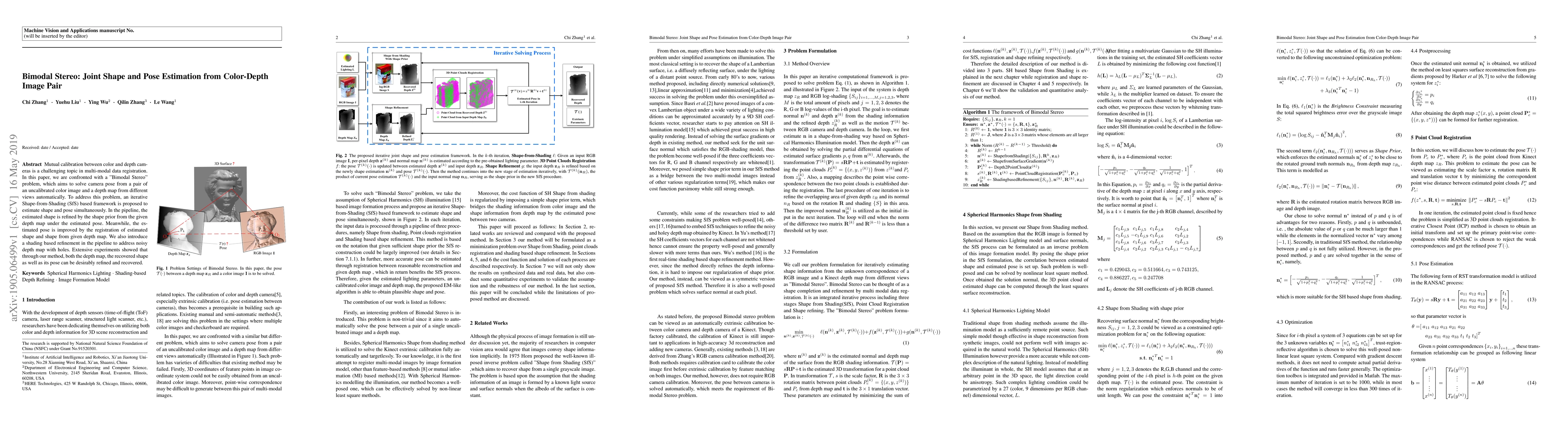 Mutual calibration between color and depth cameras is a challenging topic in multi-modal data registration. In this paper, we are confronted with a "Bimodal Stereo" problem, which aims to solve camera pose from a pair of an uncalibrated color image and a depth map from different views automatically. To address this problem, an iterative Shape-from-Shading (SfS) based framework is proposed to estimate shape and pose simultaneously. In the pipeline, the estimated shape is refined by the shape prior from the given depth map under the estimated pose. Meanwhile, the estimated pose is improved by the registration of estimated shape and shape from given depth map. We also introduce a shading based refinement in the pipeline to address noisy depth map with holes. Extensive experiments showed that through our method, both the depth map, the recovered shape as well as its pose can be desirably refined and recovered.