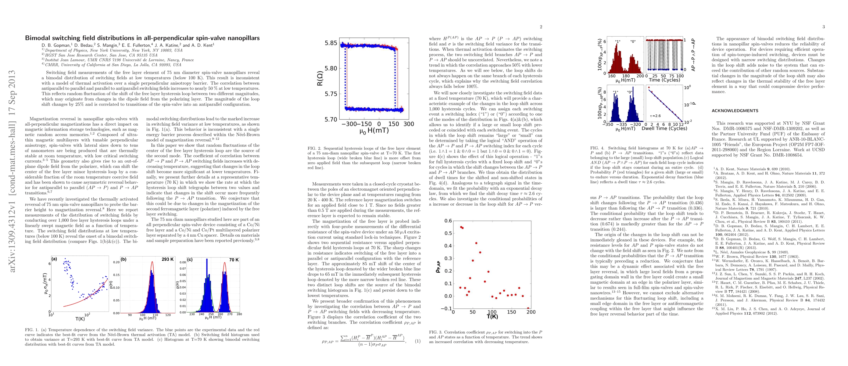 This study finds bimodal switching field distributions in 75 nm diameter spin-valve nanopillars at low temperatures, challenging the single barrier thermal activation model. The correlation between switching fields increases significantly, indicating a random fluctuation in the free layer's hysteresis loop shift, likely due to changes in the dipole field from the polarizing layer.